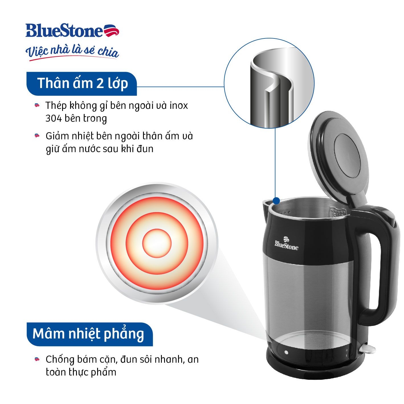 Chất liệu inox 2 lớp cao cấp dày chắc chống móp méo, gia nhiệt tốt, giữ nhiệt lâu, nấu nước an toàn, dễ dàng vệ sinh lau chùi.