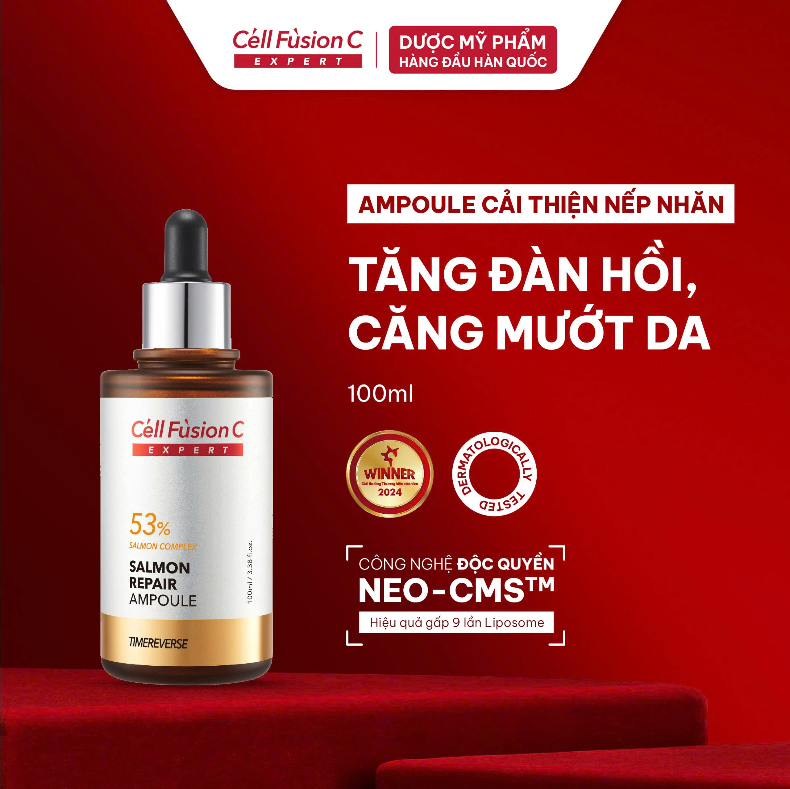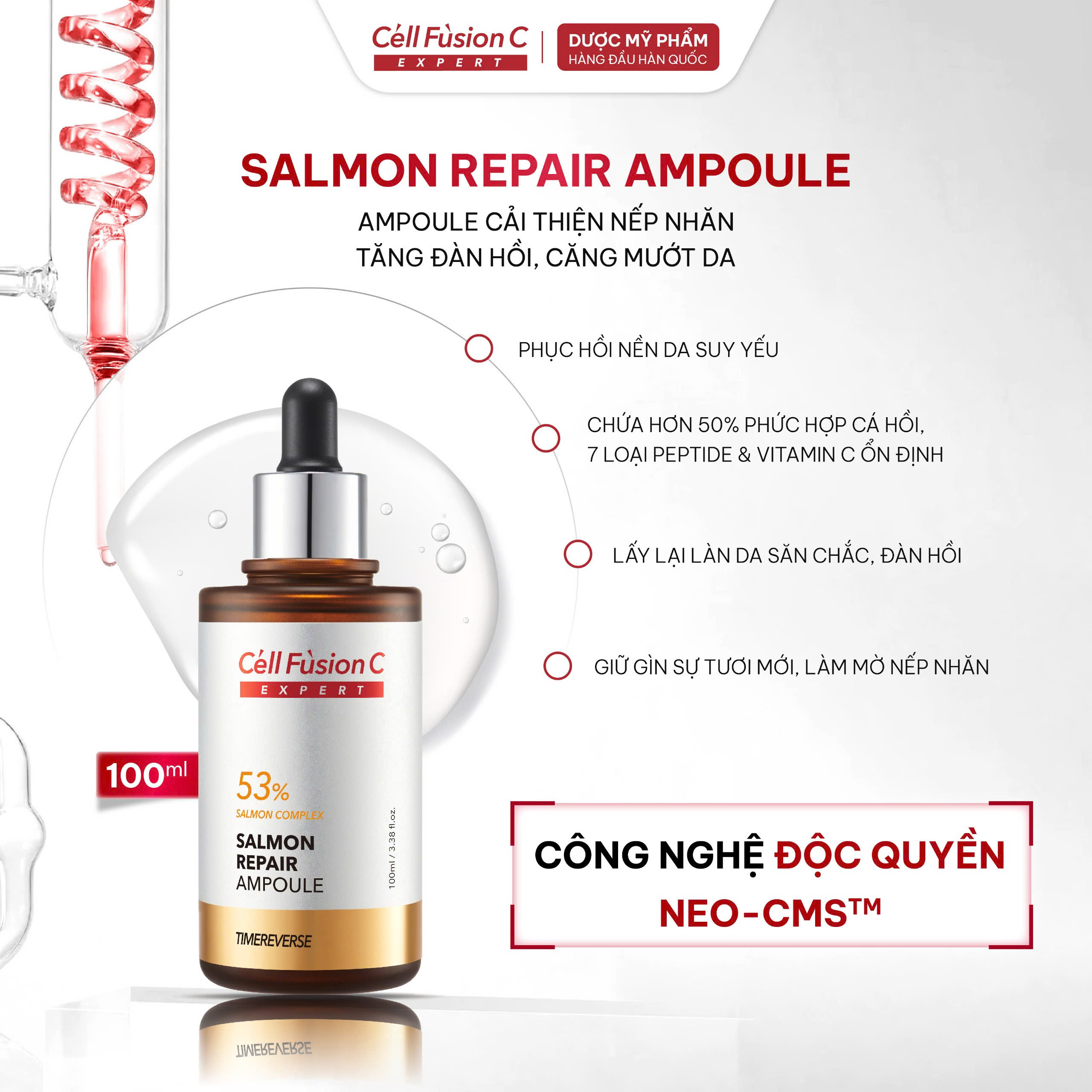 Cell Fusion C Expert Salmon Repair Ampoule là tinh chất hiếm có chứa hơn 50% phức hợp DNA cá hồi tinh khiết, kết hợp cùng 7 peptide tái cấu trúc da và vitamin C ổn định. Nhờ đó, sản phẩm mang lại hiệu quả vượt trội trong việc hỗ trợ phục hồi nền da suy yếu, cải thiện độ đàn hồi và hỗ trợ làm mờ nếp nhăn.