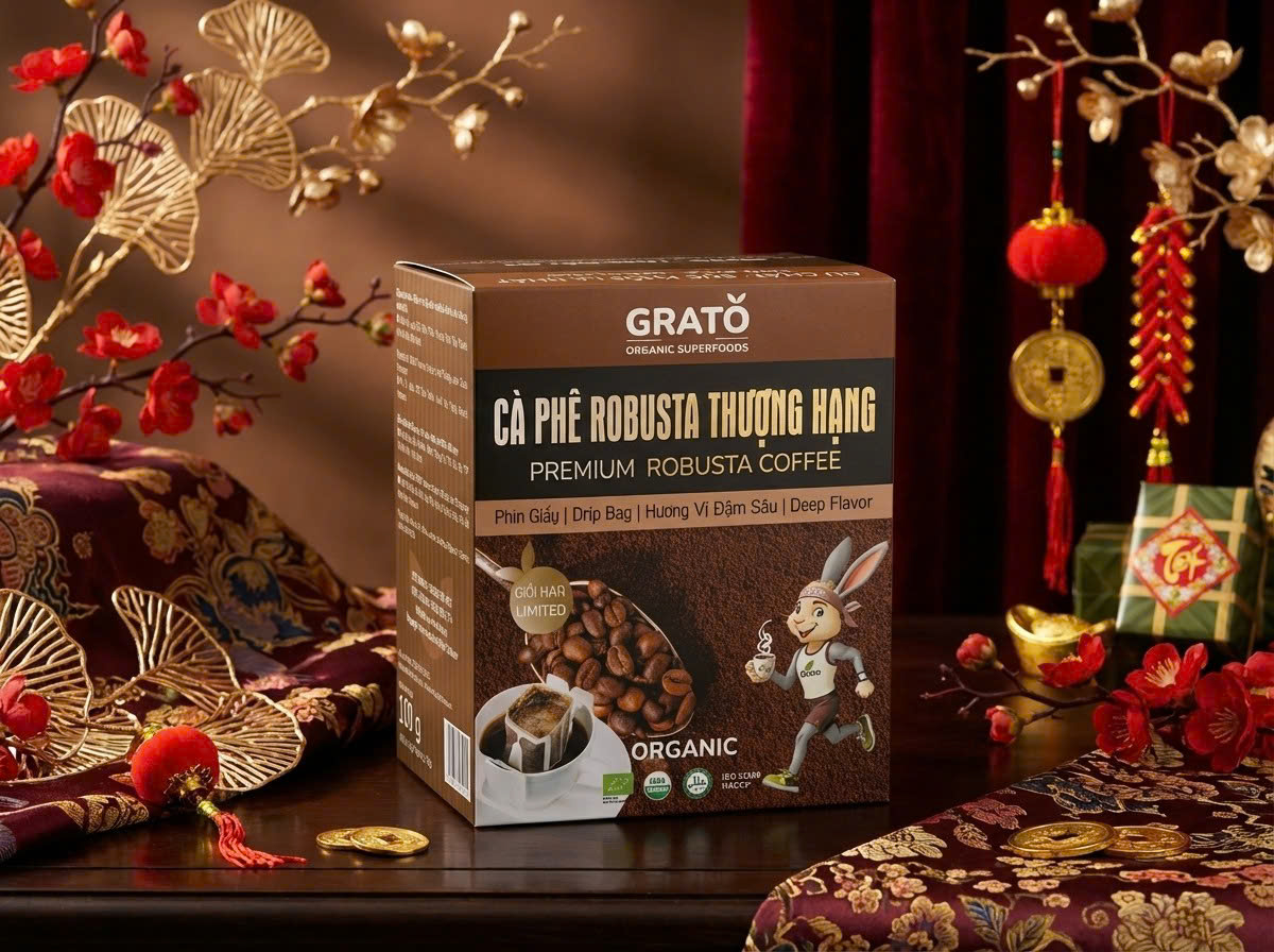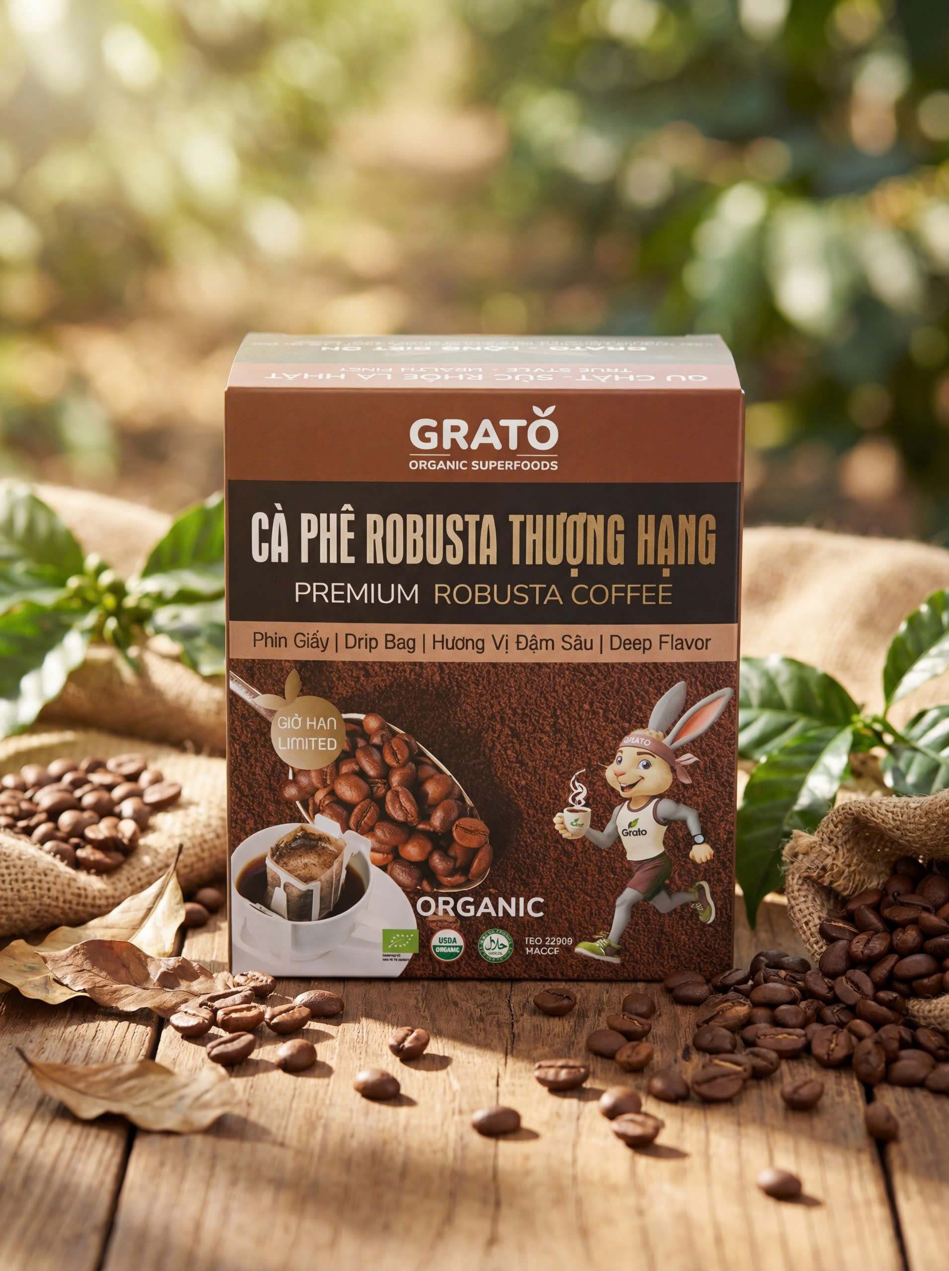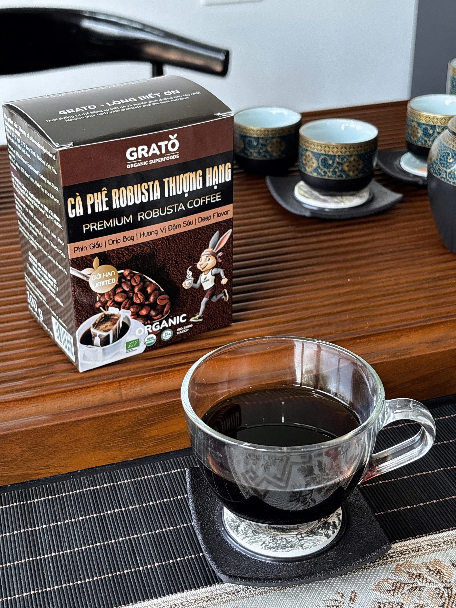 - Cà phê Robusta hữu cơ được tuyển chọn kỹ lưỡng, rang xay theo phong cách thủ công, giữ trọn hương vị nguyên bản.