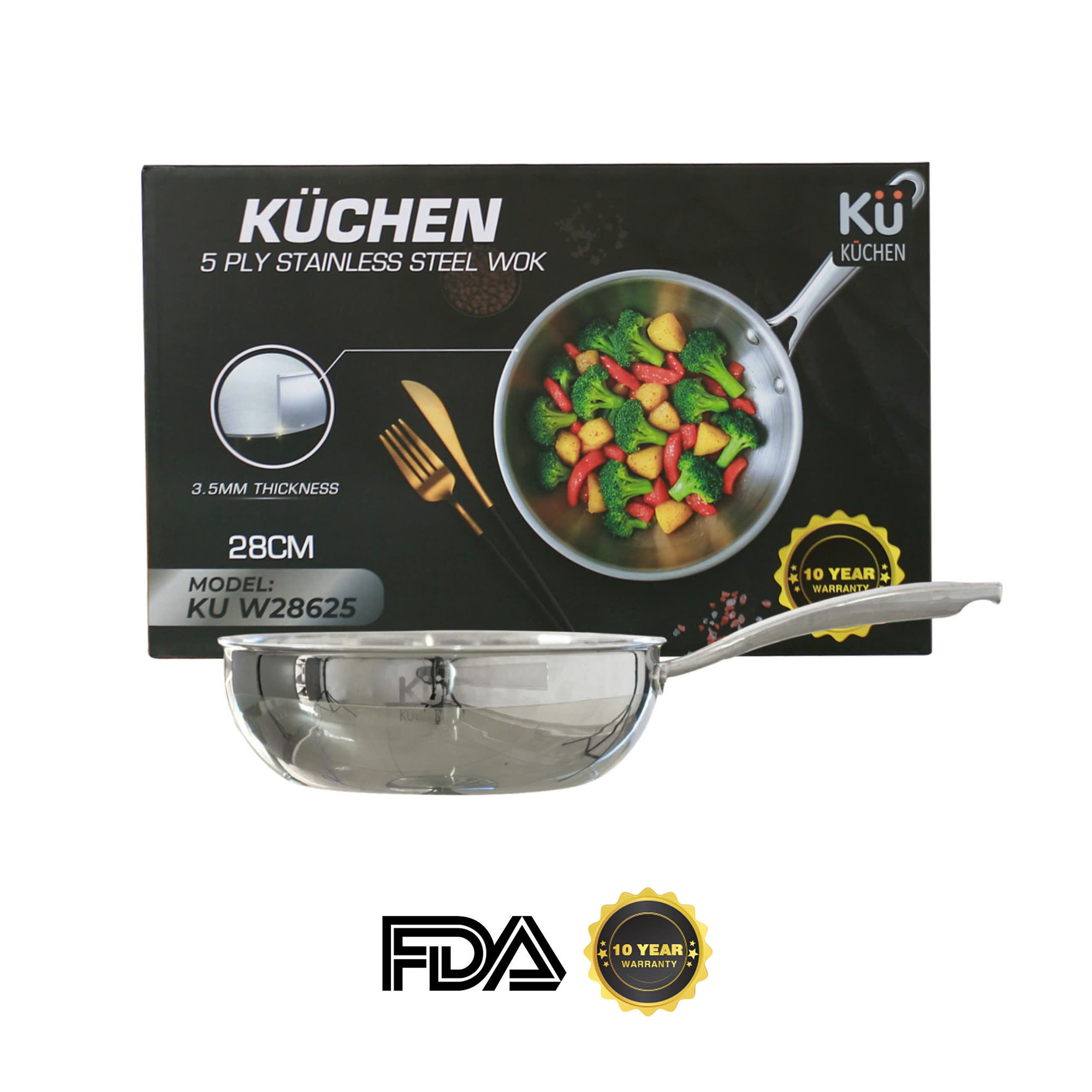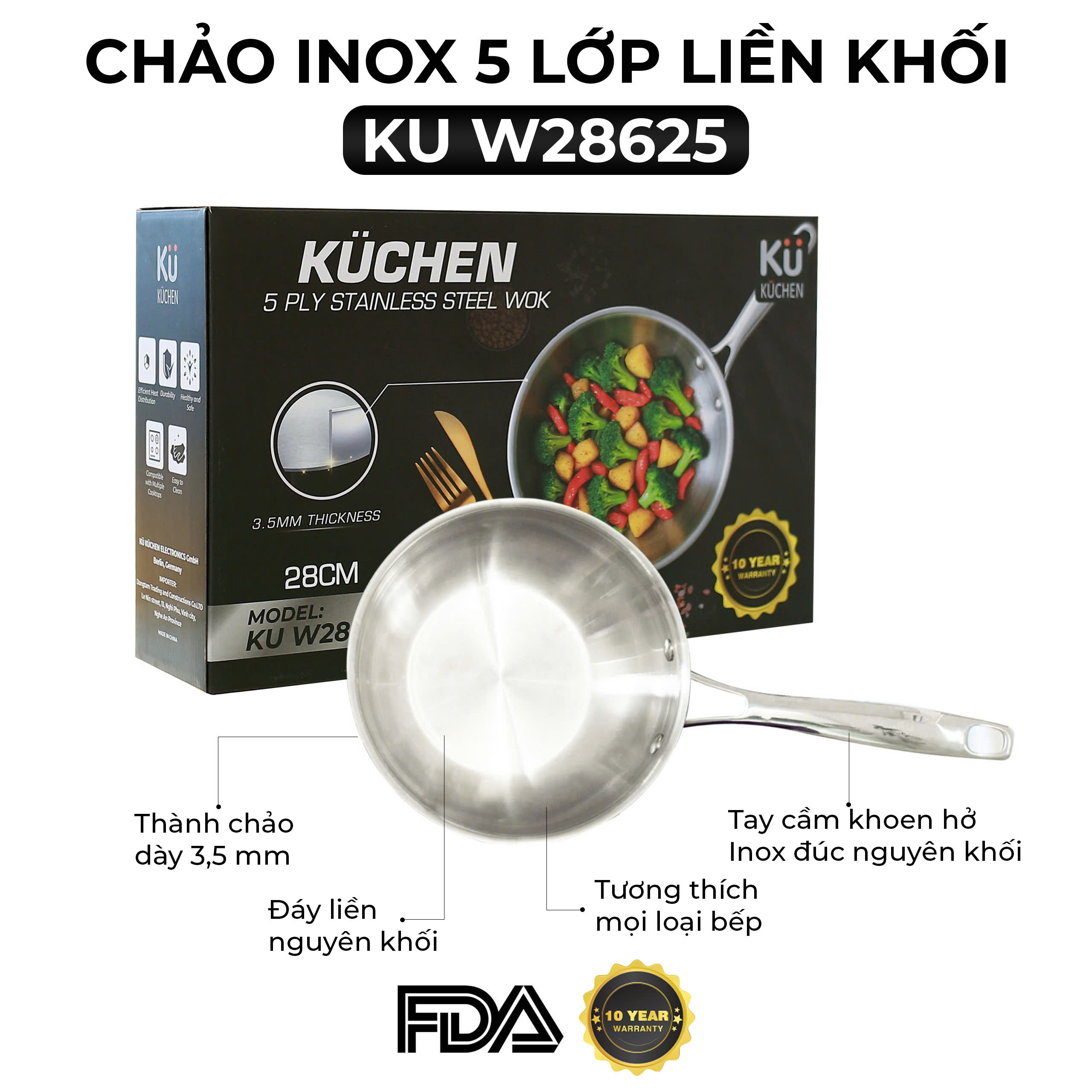 Chảo Inox Kuchen 5-Ply W28625 là lựa chọn tối ưu cho người nội trợ khắt khe, cần một sản phẩm chất lượng cao, bền bỉ và an toàn sức khỏe. Với cấu tạo 5 lớp hiện đại, thành dày 3,5 mm, đáy liền nguyên khối và tay cầm inox chắc chắn, model này đảm bảo khả năng nấu nướng chuyên nghiệp, phân tán nhiệt đều, giữ nhiệt lâu và tiết kiệm năng lượng. Bảo hành 10 năm và chứng nhận FDA (Mỹ) càng khẳng định giá trị vượt trội, đáp ứng yêu cầu khắt khe về chất lượng và vệ sinh cho gian bếp hiện đại.