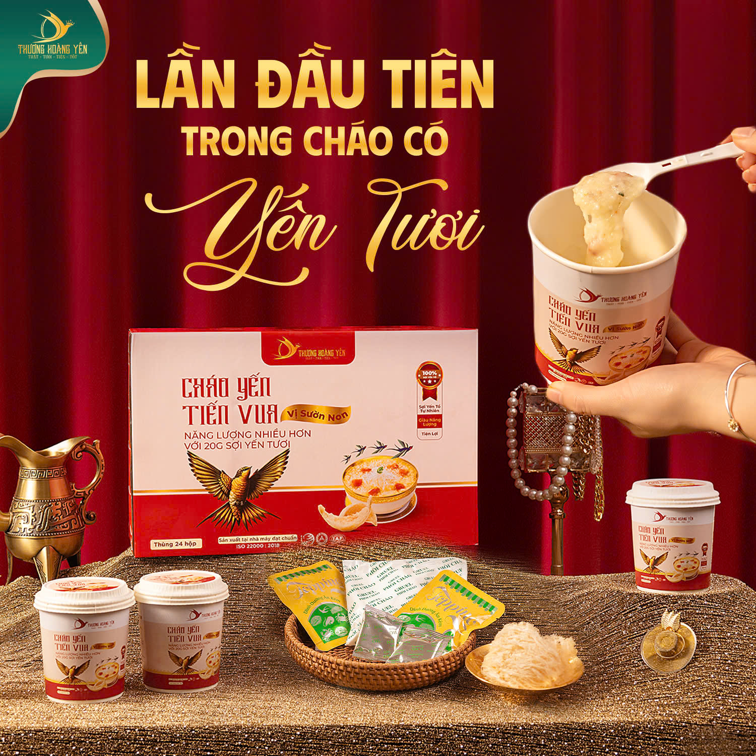 Cháo yến vị cốt gà: Gạo được nấu bung sấy thăng hoa, 20gram Yến tươi, 1 gói cốt gà cô đặc trong 3 giờ, 1 gói dầu.