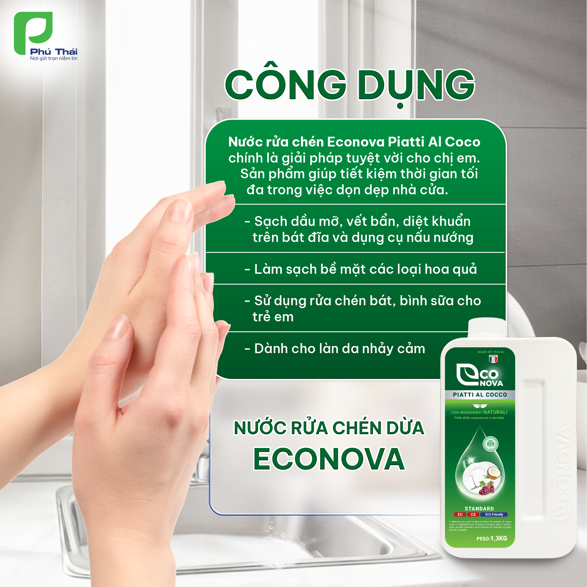 5. Công dụng: Làm sạch chén bát và các dụng cụ nhà bếp. An toàn để rửa bình sữa và dụng cụ ăn uống cho trẻ nhỏ. Có thể rửa bề mặt củ quả. Chiết xuất từ Dừa già giúp làm sạch nhanh chóng dầu mỡ, khử mùi hôi tanh hiệu quả, không bám mùi trên hoa quả, đặc biệt mềm mại với da tay.