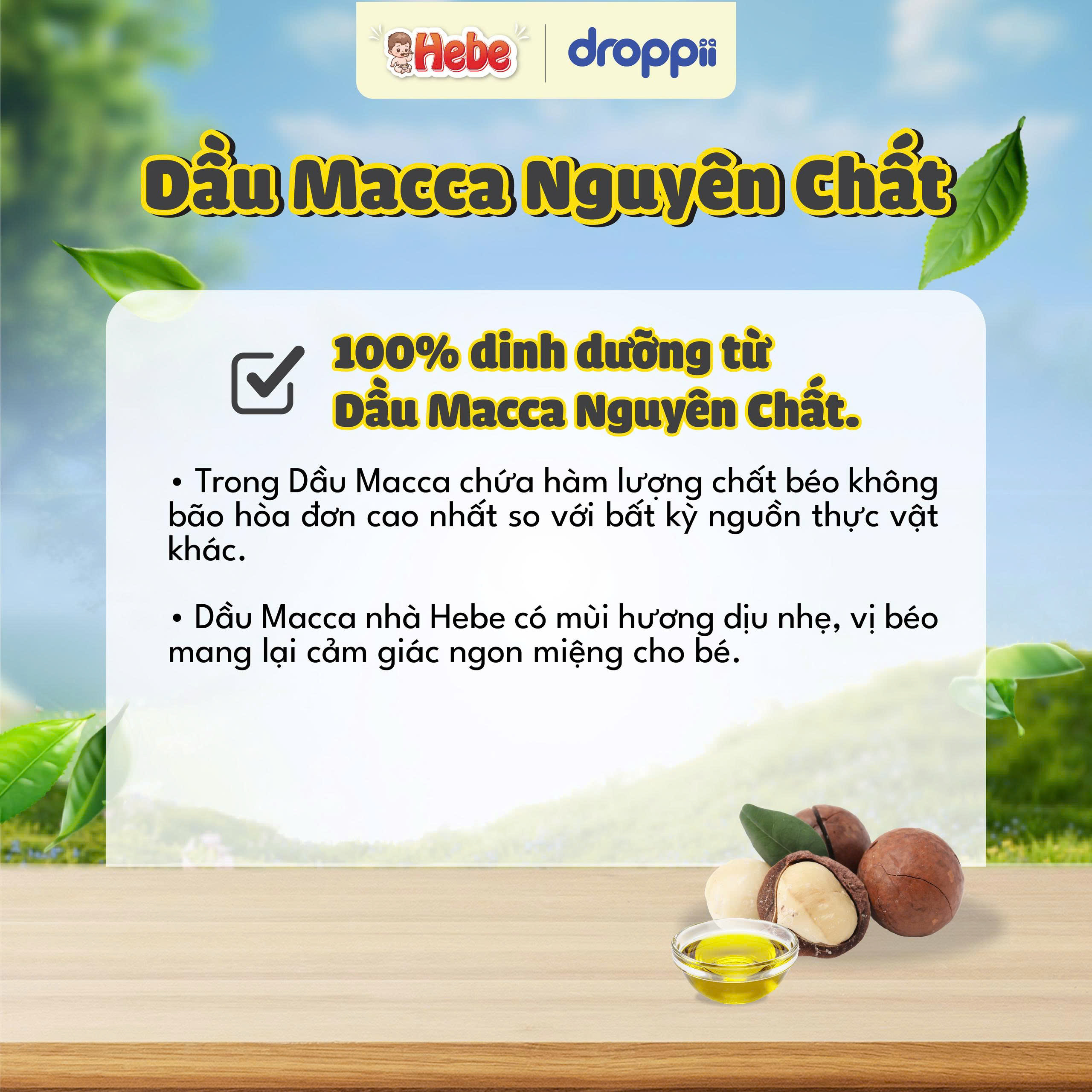 Thành phần: Trong 100ml Dầu Macca Hebe 100% nguyên chất chứa: