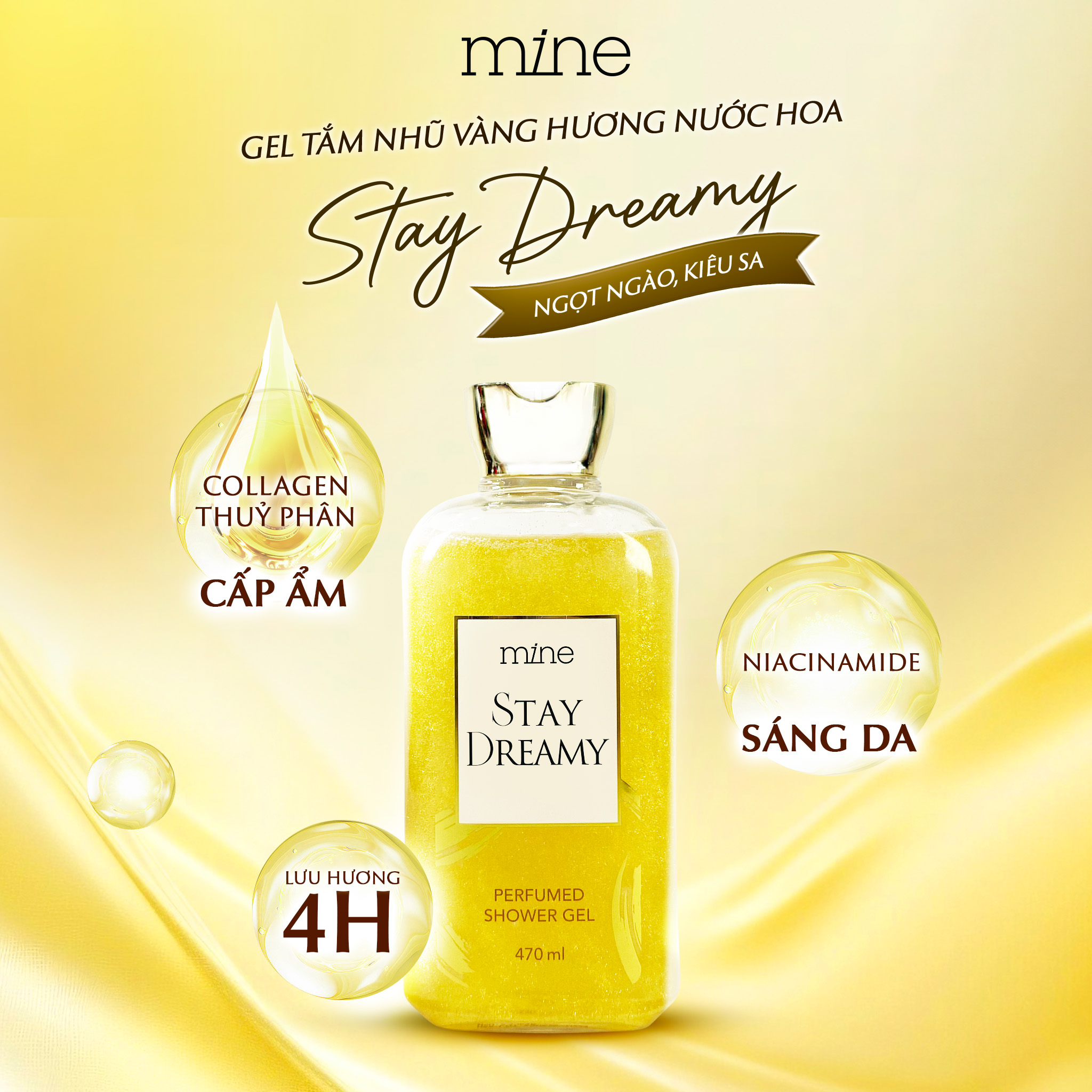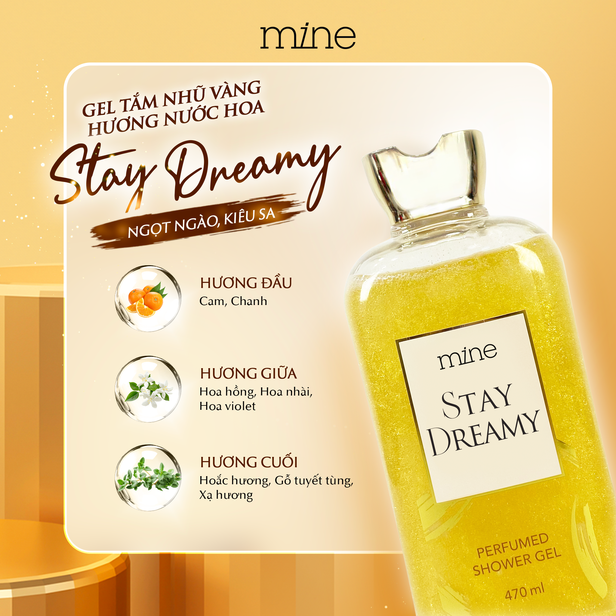 1. Tên sản phẩm: Gel tắm trắng nhũ vàng nước hoa Mine Stay Dreamy 470ml