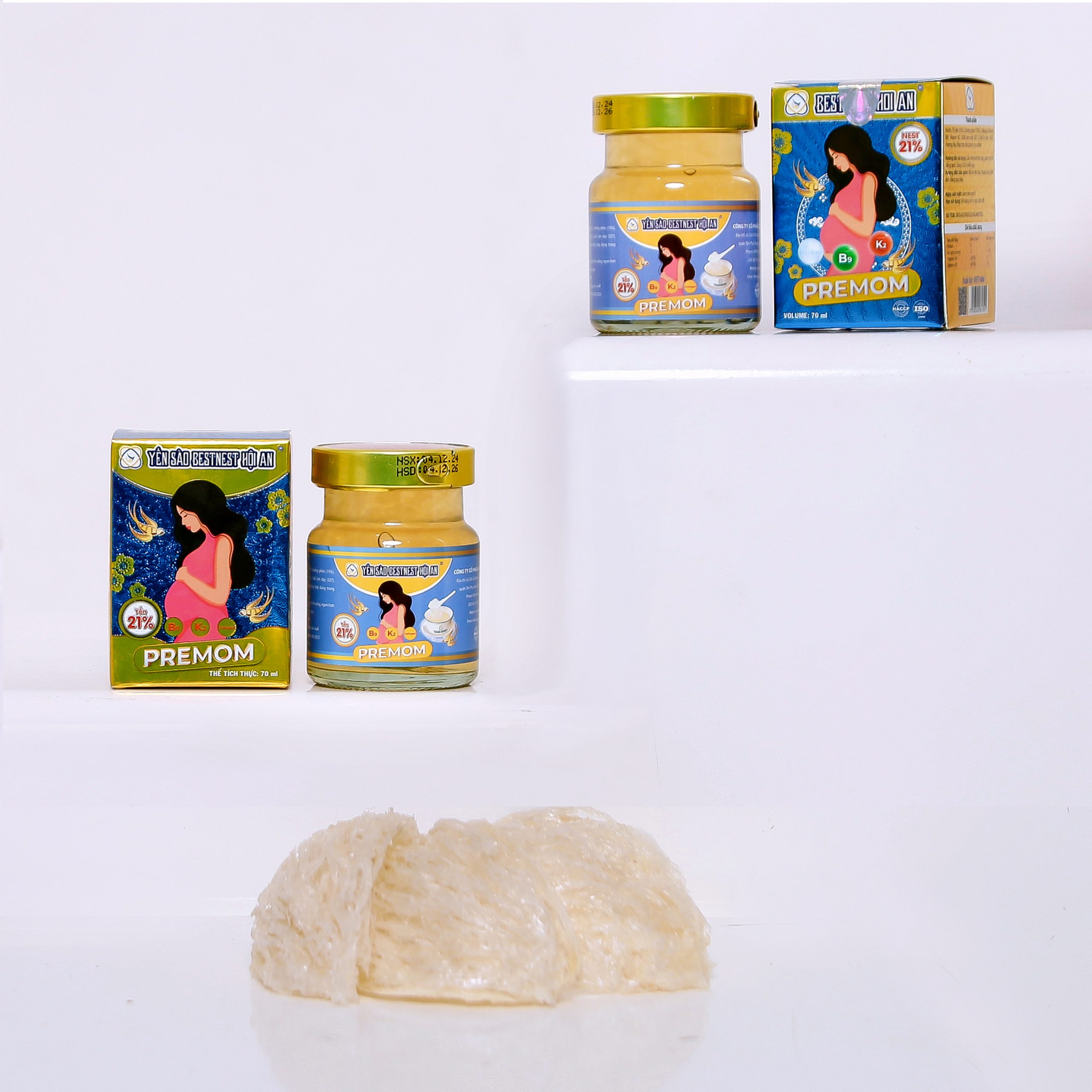 – Yến sào giàu dinh dưỡng, chứa đến 18 loại axit amin và 31 khoáng chất thiết yếu giúp cơ thể tái tạo năng lượng và duy trì sức khoẻ tổng thể. Ngoài ra, trong tổ yến còn chứa collagen, các vitamin thiết yếu, nhiều protein quý giá mà cơ thể không thể tự tổng hợp được. – Tổ yến chưng PREMOM là sự kết hợp giữa tinh hoa yến sào cùng với collagen và các loại vitamin thiết yếu khác, có tác dụng làm giảm thai nghén, cung cấp dưỡng chất, tăng sức đề kháng cho mẹ và thai nhi. Đặc biệt giảm rạng da, thâm nám, viêm da cơ địa khi mang thai, trầm cảm và căng thẳng cho mẹ bầu. – Yến sào chứa nhiều vitamin và khoáng chất sẽ giúp kích thích và phát triển trí não cho bé từ trong bụng mẹ – Sản phẩm sử dụng đường phèn được làm hoàn toàn từ cây mía, an toàn, lành tính, tốt cho sức khoẻ vì chứa ít calo hơn và ít đường hơn so với đường tinh luyện, đường kính trắng. – Ngoài ra, mỗi sản phẩm được tung ra thị trường đều được dán tem truy xuất nguồn gốc rõ ràng, tem chống hàng giả do Bộ Công An cấp và Bản tự công bố sản phẩm thể hiện rõ các tiêu chí chất lượng và thành phần hoàn toàn lành tính, an toàn 100%. |