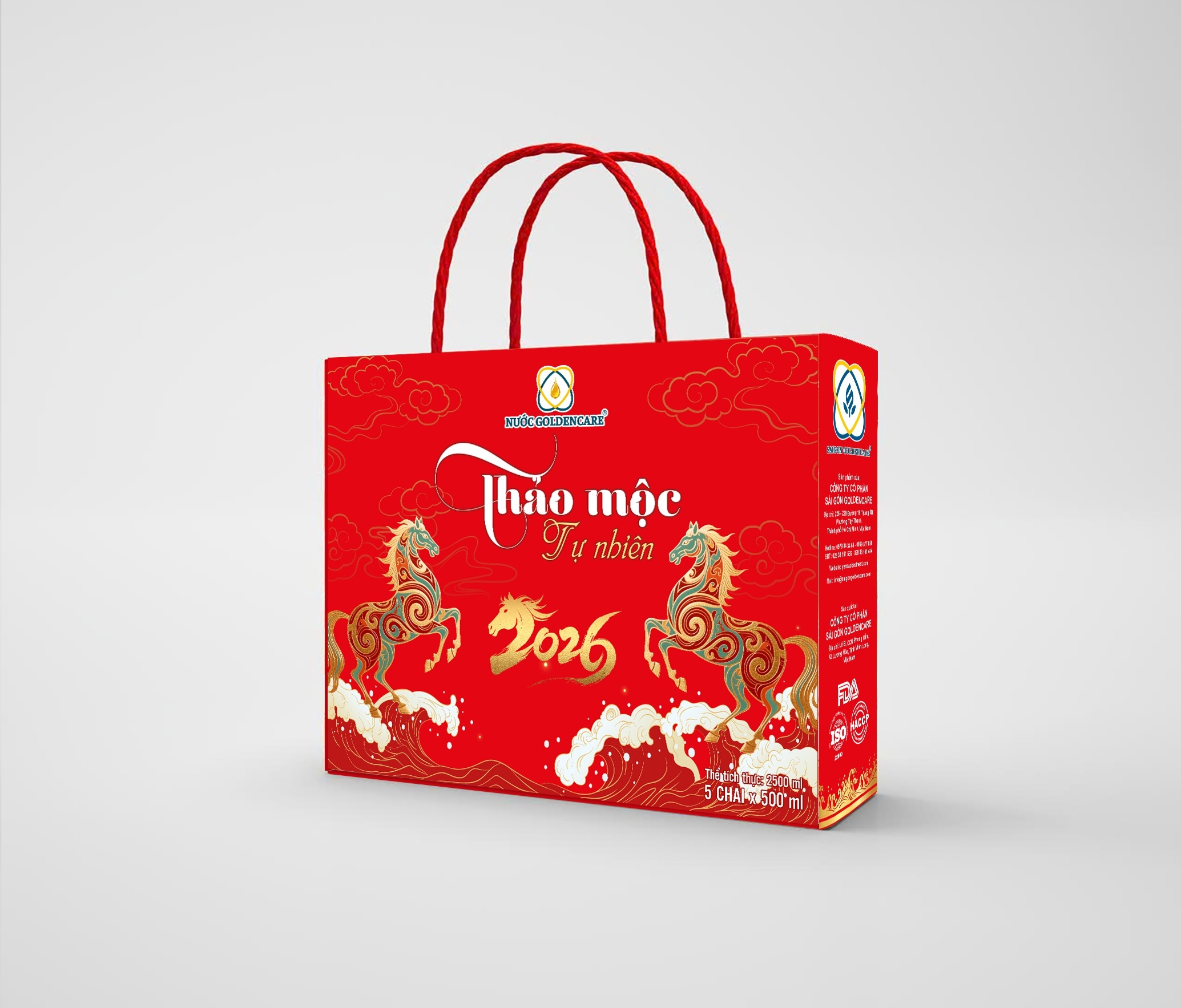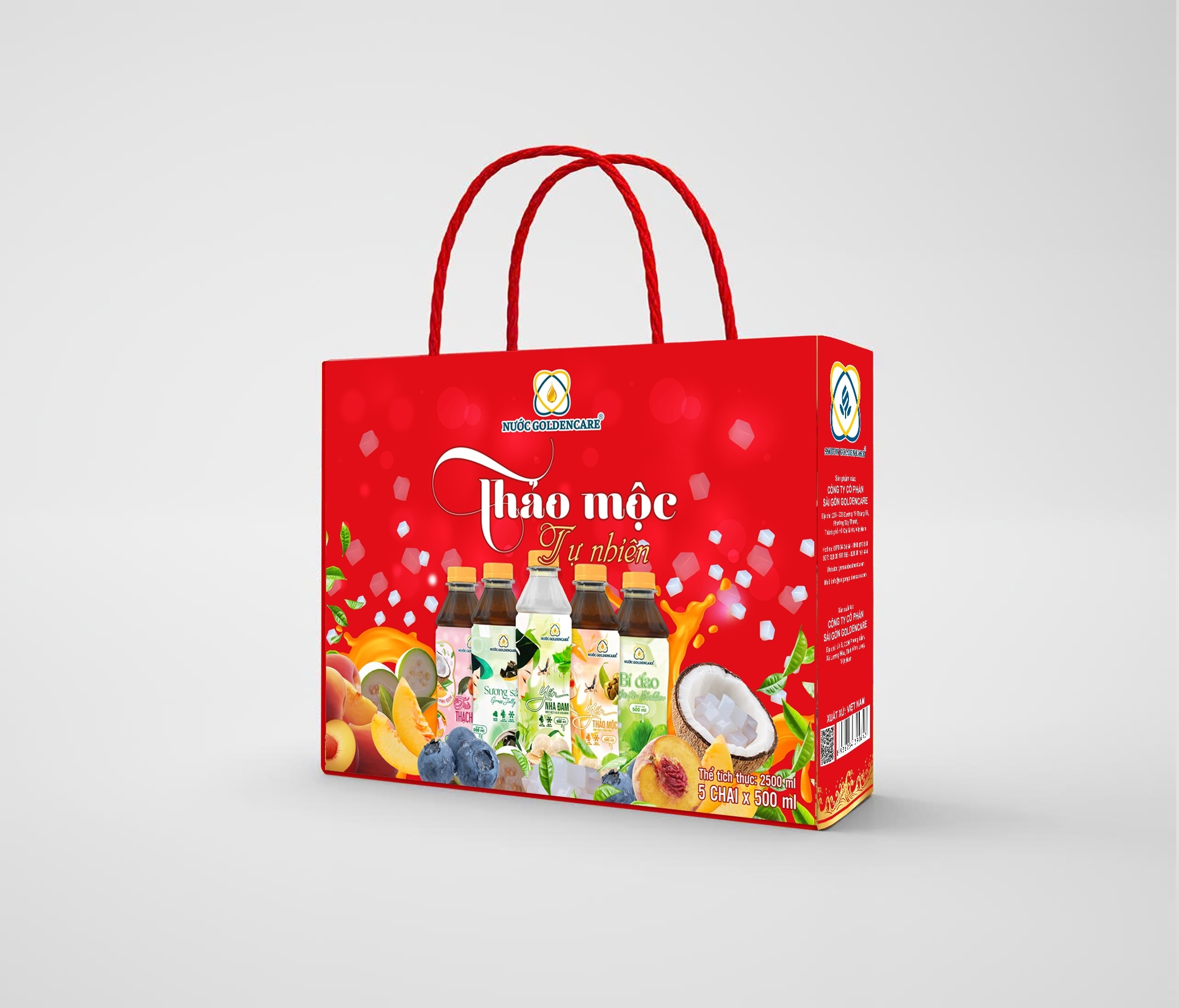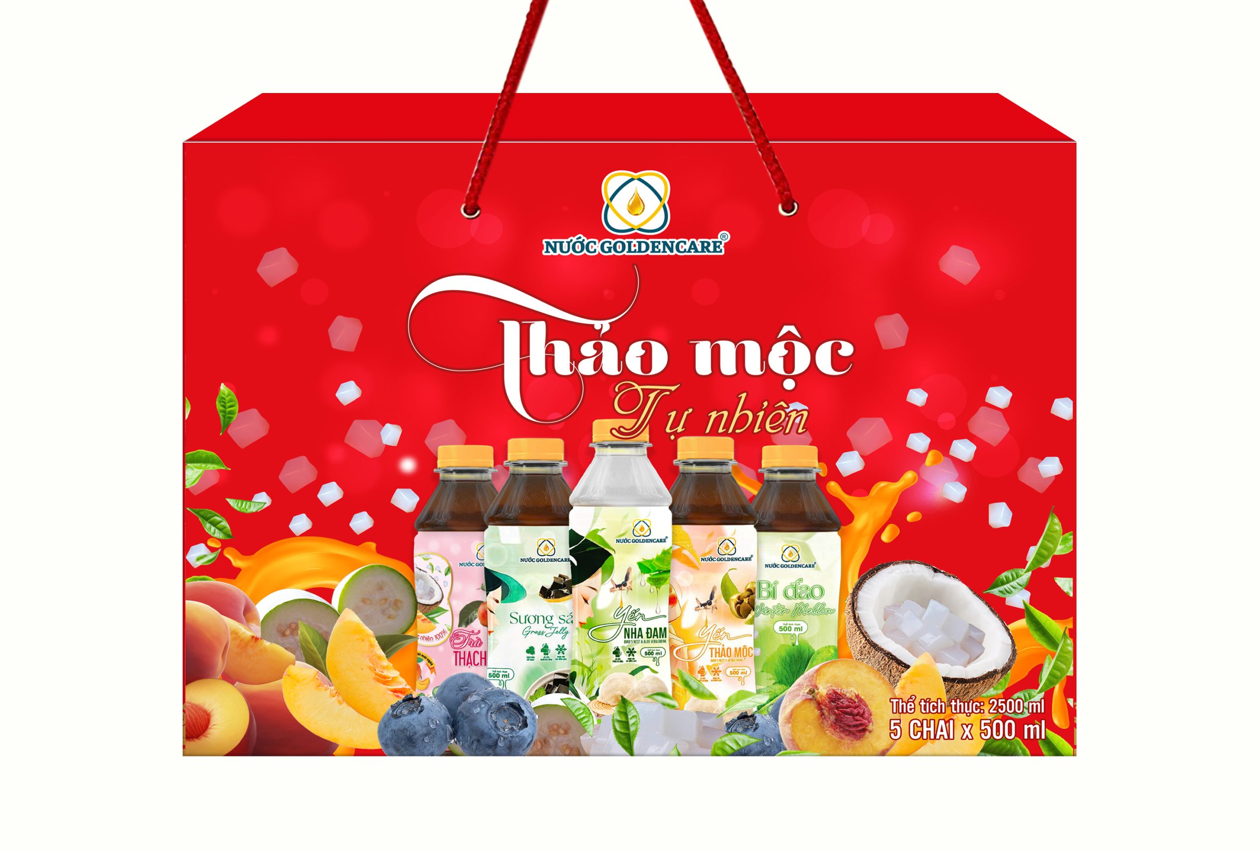 Hộp 5 chai Nước GoldenCare mix vị (500 ml) gồm các loại Yến nha đam – Sương sáo – Yến thảo mộc – Trà thạch đào – Bí đao, đa dạng vị trải nghiệm cho nhiều đối tượng khách hàng