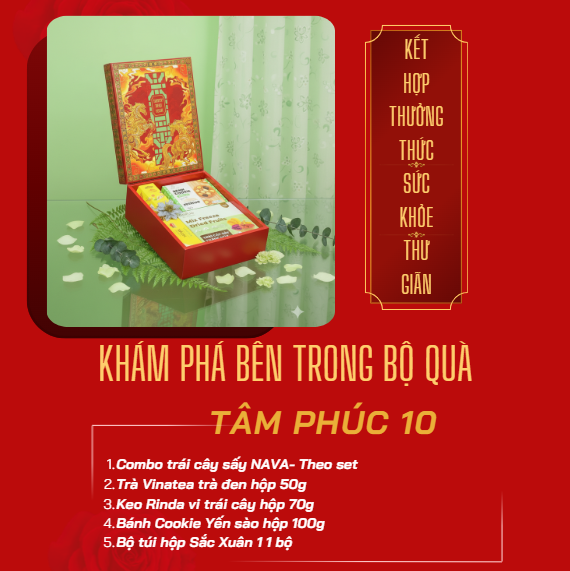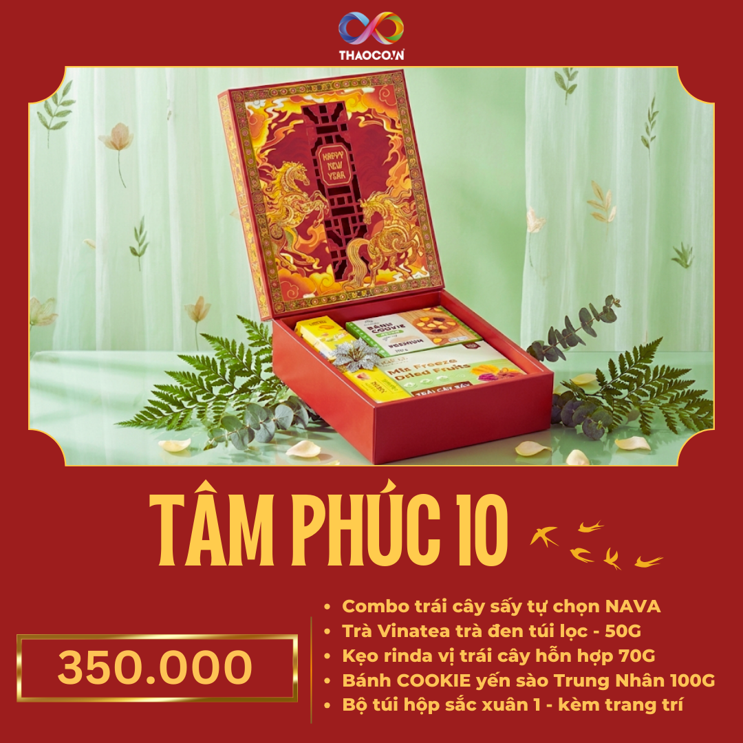 Hộp quà Tâm Phúc 10 được xây dựng với thông điệp đủ đầy – may mắn – thịnh vượng, phù hợp làm quà biếu đầu năm cho đối tác, khách hàng và người thân.