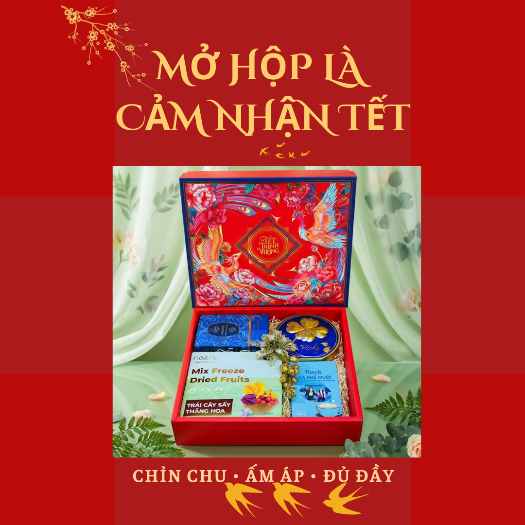 - Hộp quà tông đỏ truyền thống, họa tiết xuân