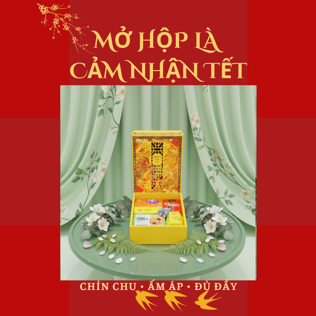 · Hộp quà tông vàng nổi bật, họa tiết xuân truyền thống