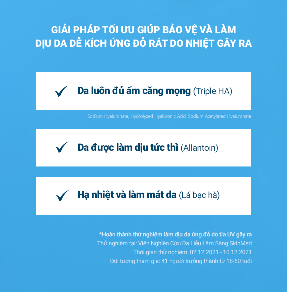 – Triple Hyaluronic Acid: Cấp ẩm sâu hơn vào trong các tế bào da ở dưới biểu bì, giữ cho da luôn ngậm nước và căng mướt.