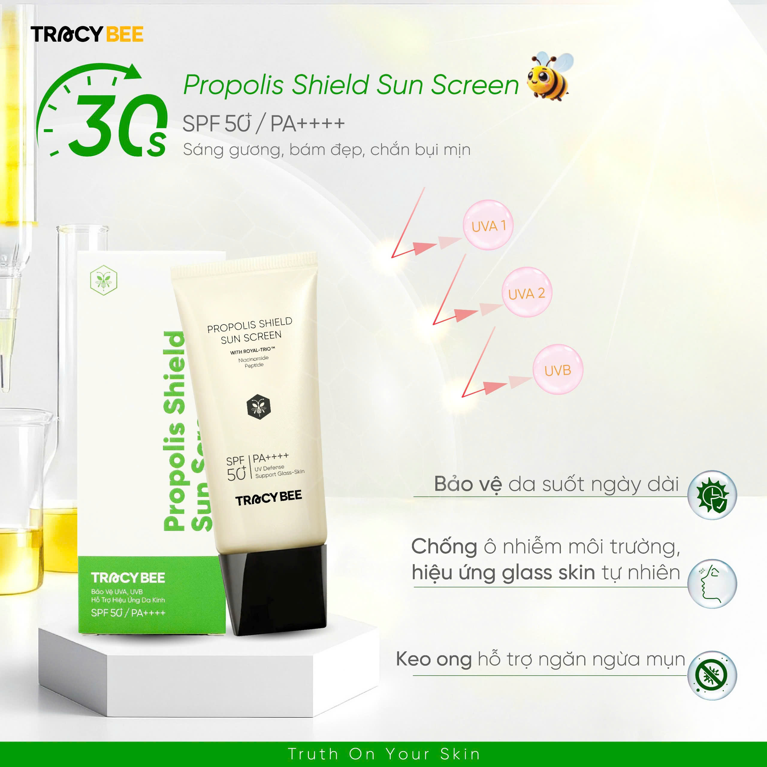 - Hợp chất Royal Trio™: Keo ong, mật ong lên men, sữa ong chúa (phục hồi, dưỡng sáng)