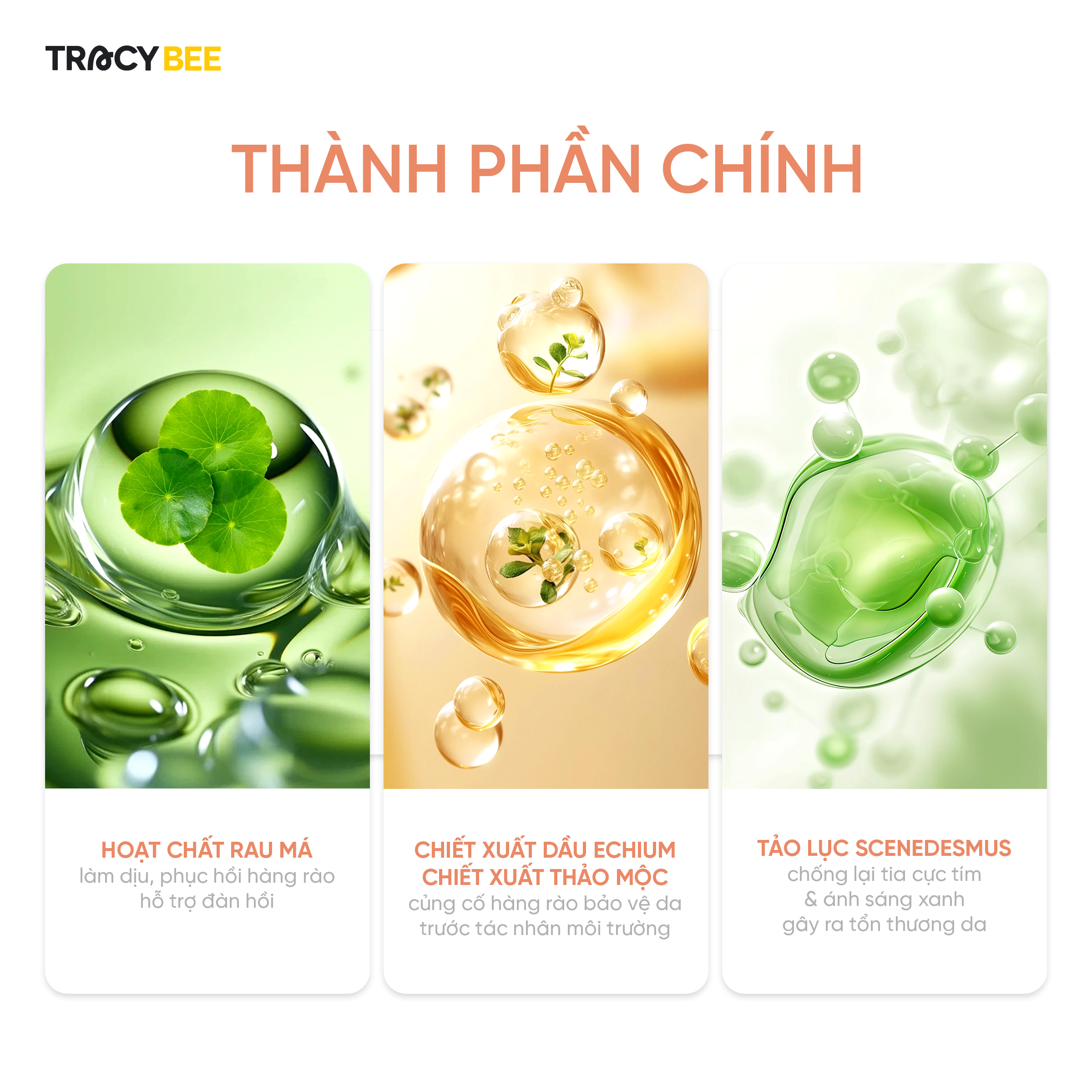 - Niacinamide, hoạt chất rau má, tảo lục – làm dịu, phục hồi, kháng viêm