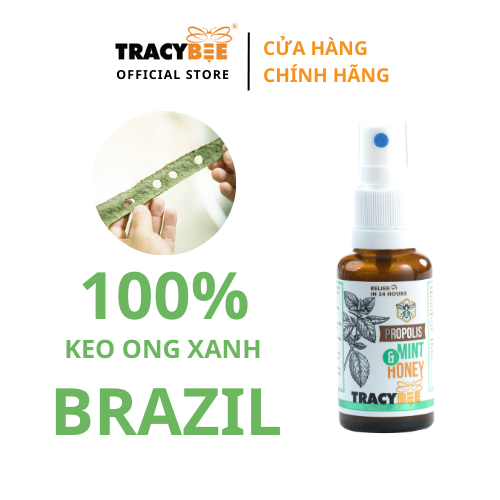Keo ong xanh dạng xịt vị bạc hà Tracybee , thành phần trong 30 ml dung dich: gồm chiết xuất keo ong 19,36g, nước 9,97g, mật ong 1,55g, tinh dầu bạc hà 0,06g, chất làm dày xanthan gum