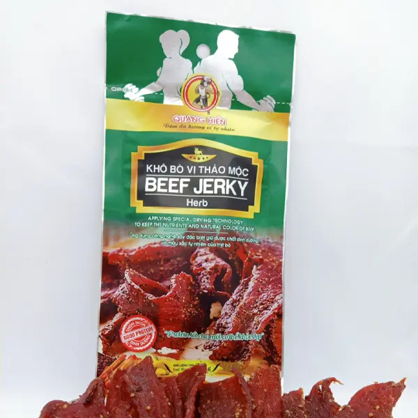 Khô Bò Vị Thảo Mộc – Buffalo Jerky Herb: Thịt bò 90%, thảo mộc 2% ( lá hương thảo, hạt ngò quế khâu, thảo quả, đinh hương), muối, đường, bột tỏi, chiết xuất nấm men, chất bảo quản tự nhiên VMC nature (ISN: 261, 325, 316,511)