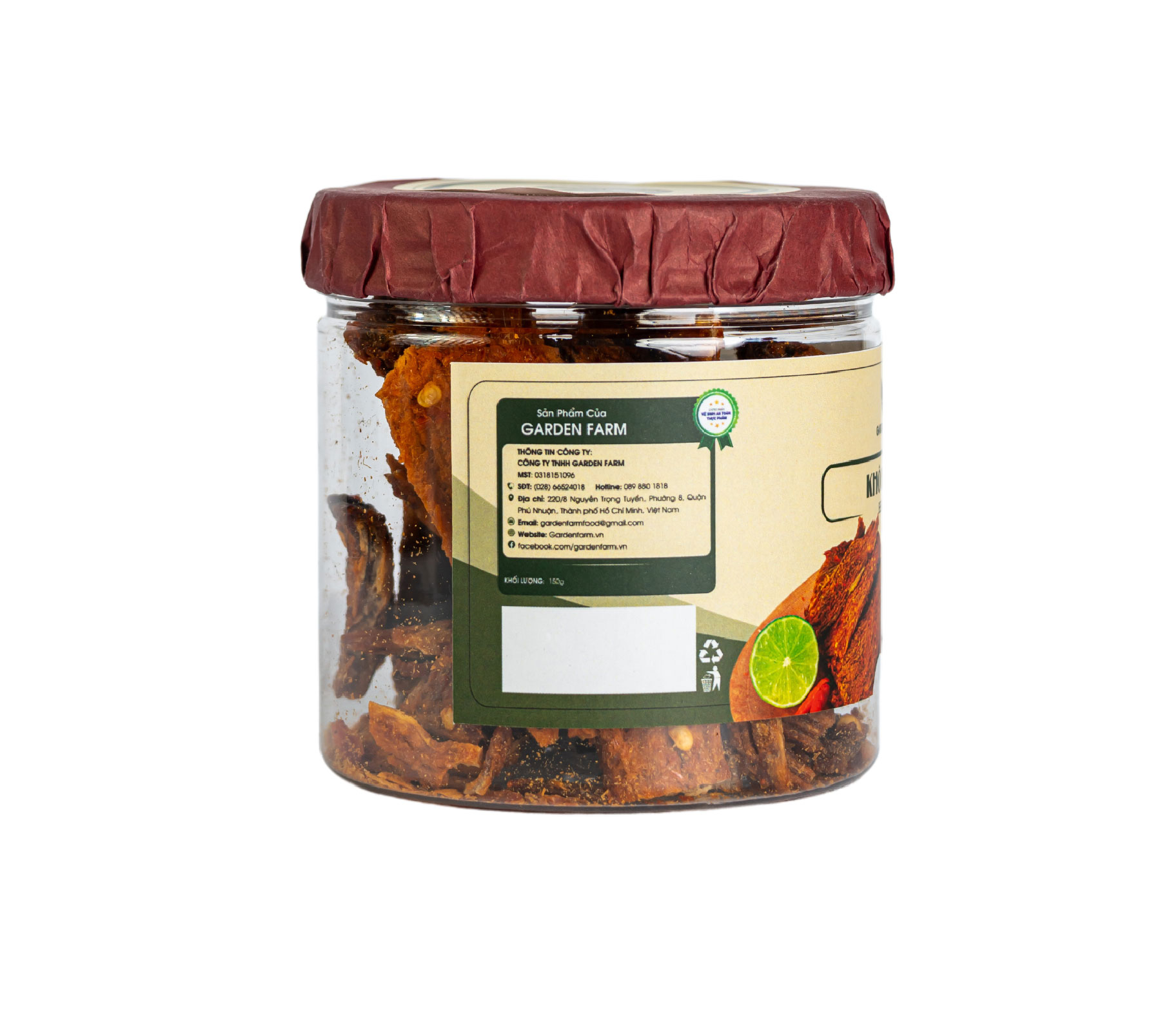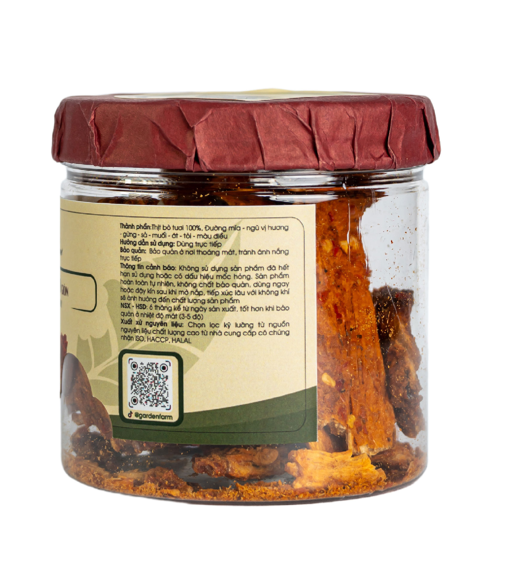 | THÀNH PHẦN | Thịt bò ( 90%), đường tinh luyện, muối, tỏi, ớt, ngũ vị hương ( 1%), bột nghệ. |
