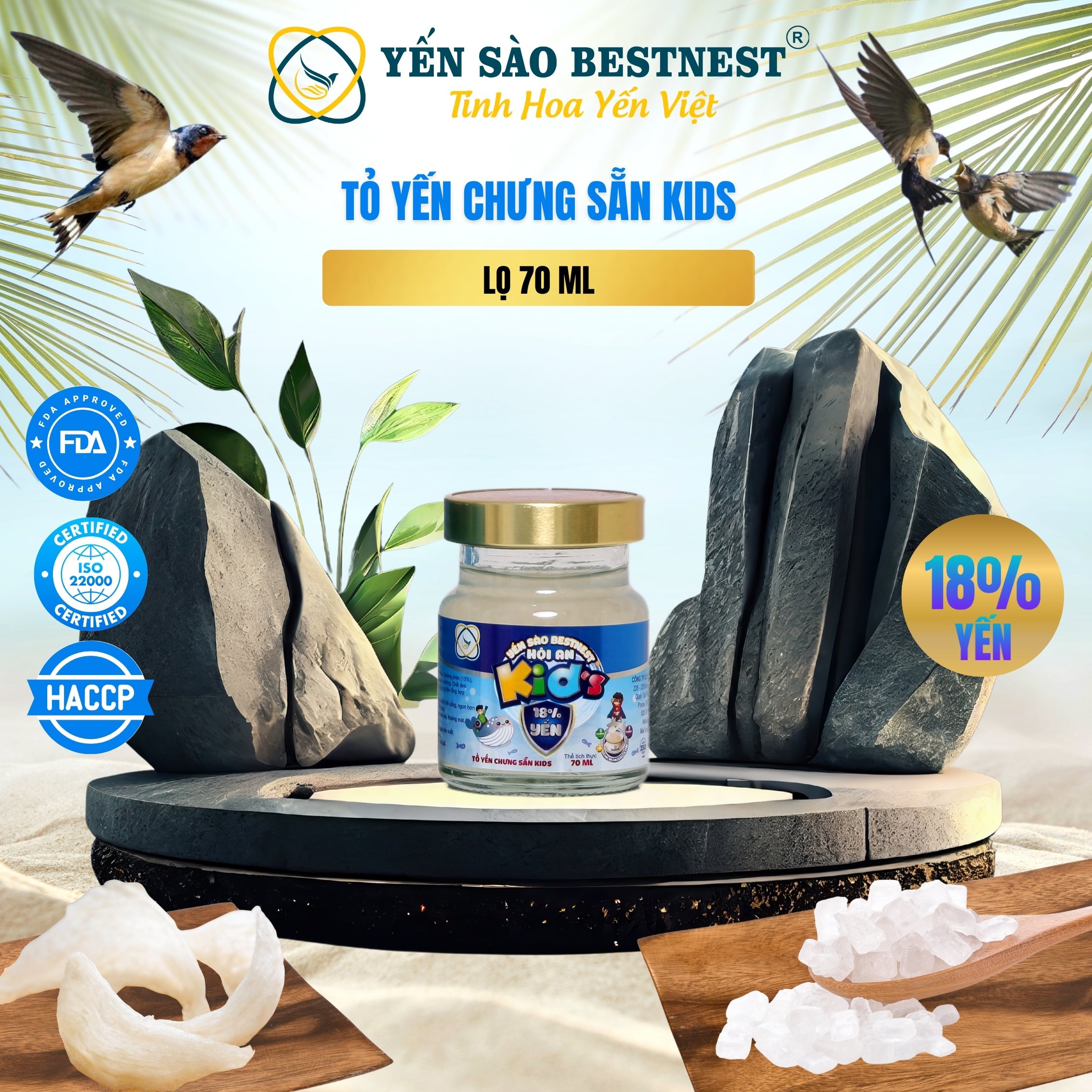 – Yến sào giàu dinh dưỡng, chứa đến 18 loại axit amin và 31 khoáng chất thiết yếu giúp cơ thể tái tạo năng lượng và duy trì sức khoẻ tổng thể. Ngoài ra, trong tổ yến còn chứa collagen, các vitamin thiết yếu, nhiều protein quý giá mà cơ thể không thể tự tổng hợp được. – Tổ yến chưng sẵn Kids là một giải pháp tuyệt vời, bổ sung đầy đủ các khoáng chất thiết yếu, vitamin, canxi, lysine, các xơ dinh dưỡng,… giúp bé hoàn thiện hệ miễn dịch, nâng cao sức đề kháng, phát triển toàn diện cả về thể lực và trí lực, san sẻ được nổi lo âu cho mẹ. – Sản phẩm sử dụng đường phèn được làm hoàn toàn từ cây mía, an toàn, lành tính, tốt cho sức khoẻ vì chứa ít calo hơn và ít đường hơn so với đường tinh luyện, đường kính trắng. – Ngoài ra, mỗi sản phẩm được tung ra thị trường đều được dán tem truy xuất nguồn gốc rõ ràng, tem chống hàng giả do Bộ Công An cấp và Bản tự công bố sản phẩm thể hiện rõ các tiêu chí chất lượng và thành phần hoàn toàn lành tính, an toàn 100%. |
