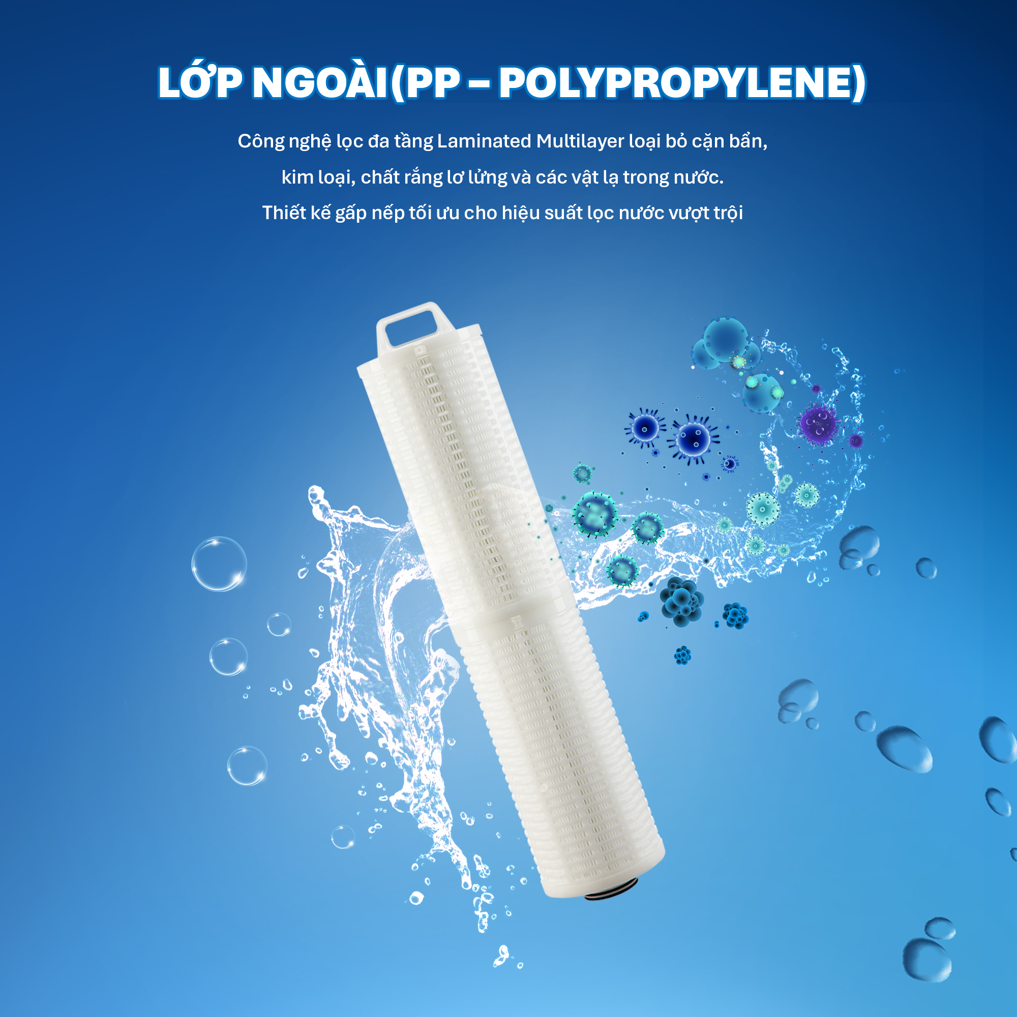 - Công nghệ lọc đa tầng Laminated Multilayer: Tăng hiệu quả loại bỏ các chất gây hại ngay từ điểm cấp nước chính.