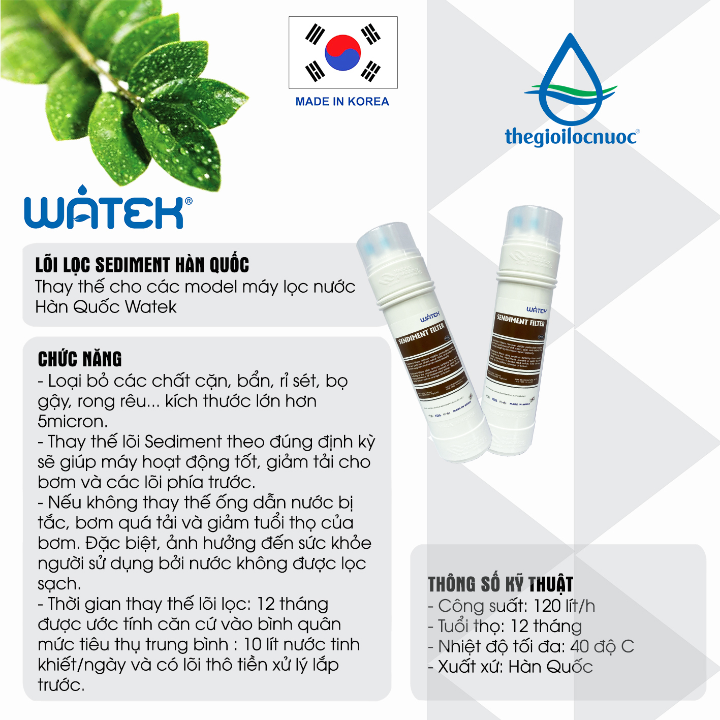 – Công suất: 120 lít/h – Tuổi thọ: 12 tháng – Nhiệt độ tối đa: 40 độ C – Xuất xứ: Hàn Quốc |