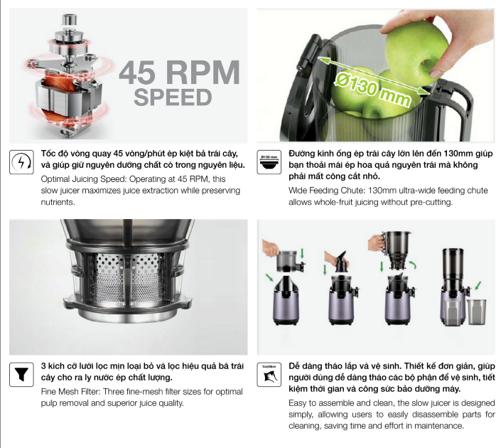 - Tốc độ vòng quay 45 vòng/phút ép kiệt bả trái cây và giúp giữ nguyên dưỡng chất có trong nguyên liệu