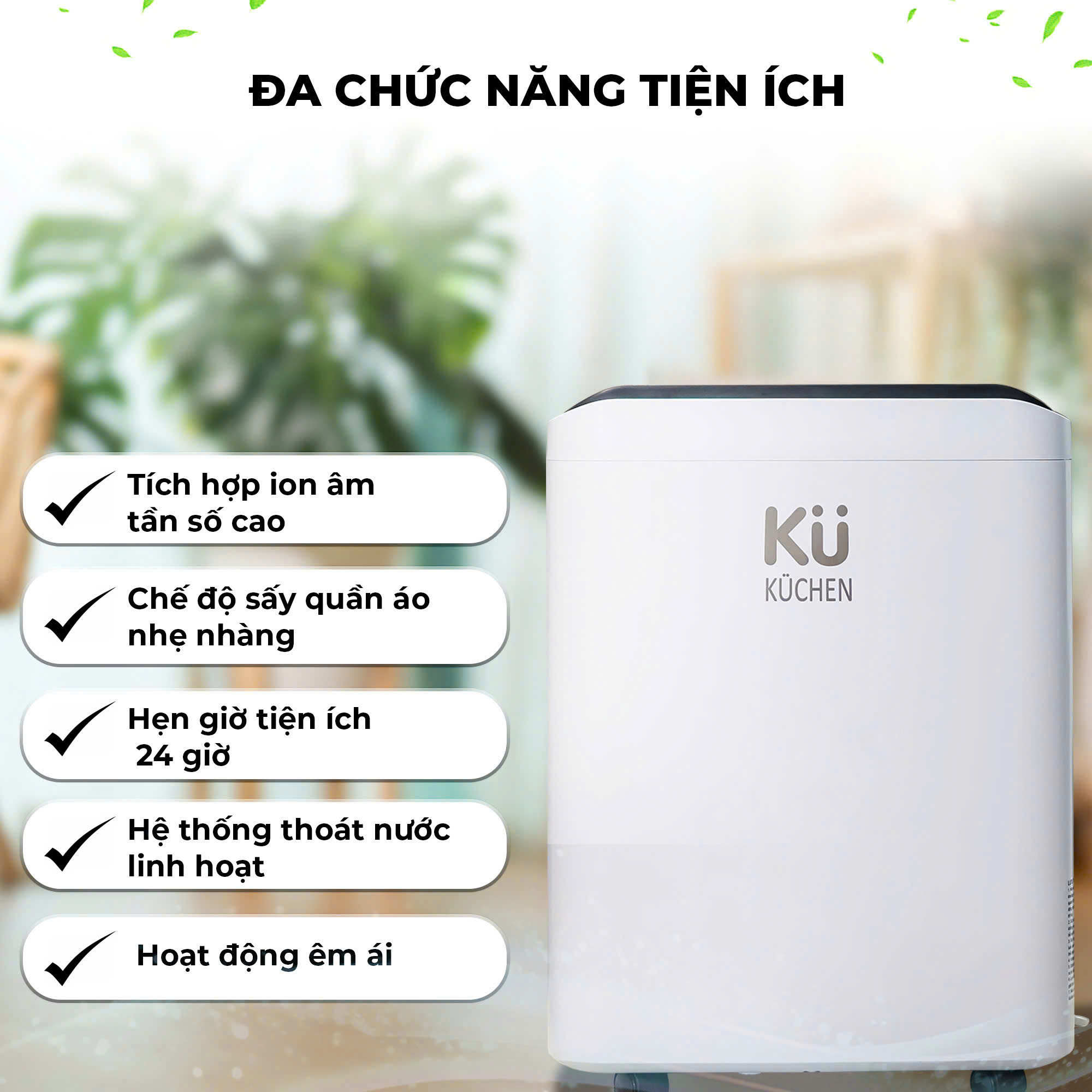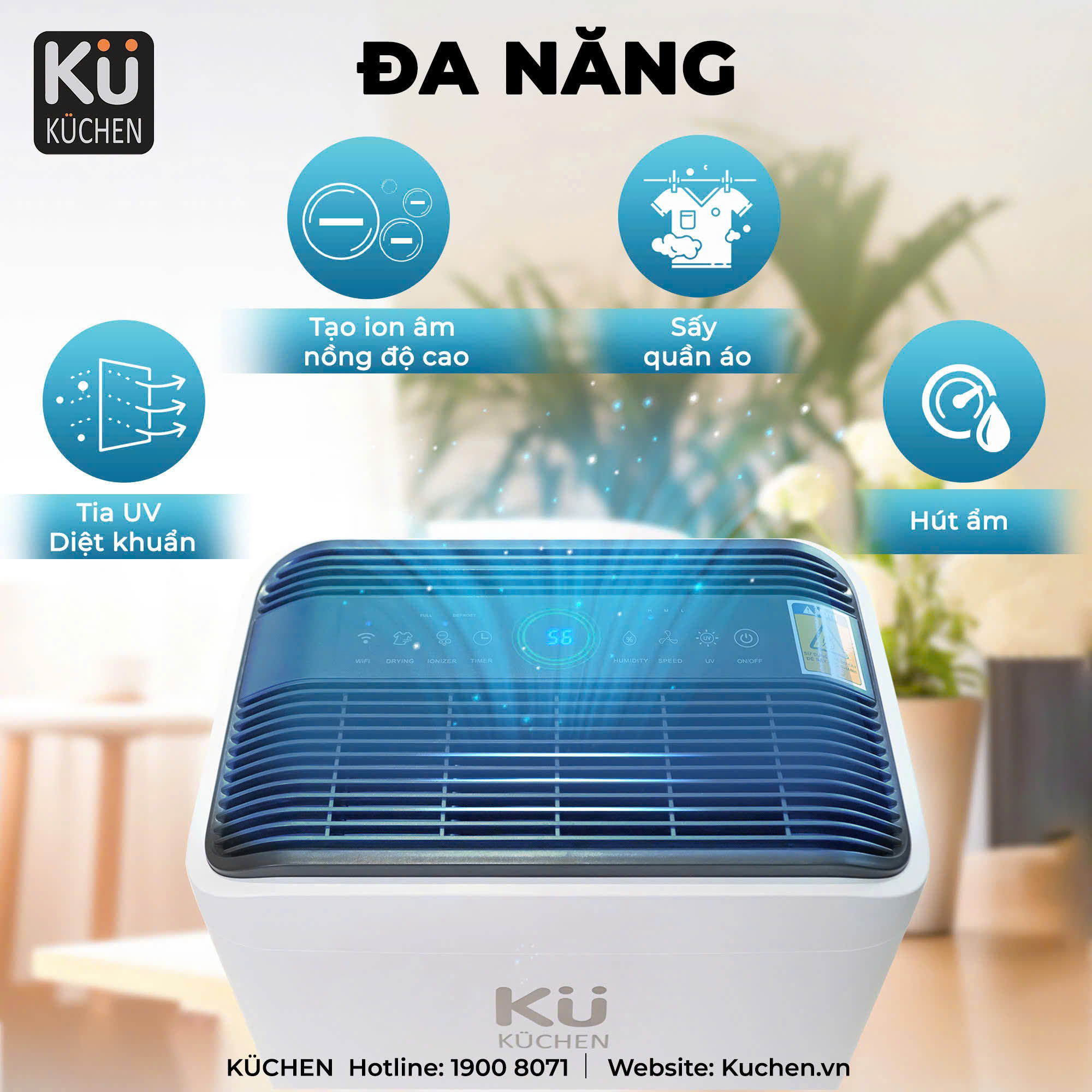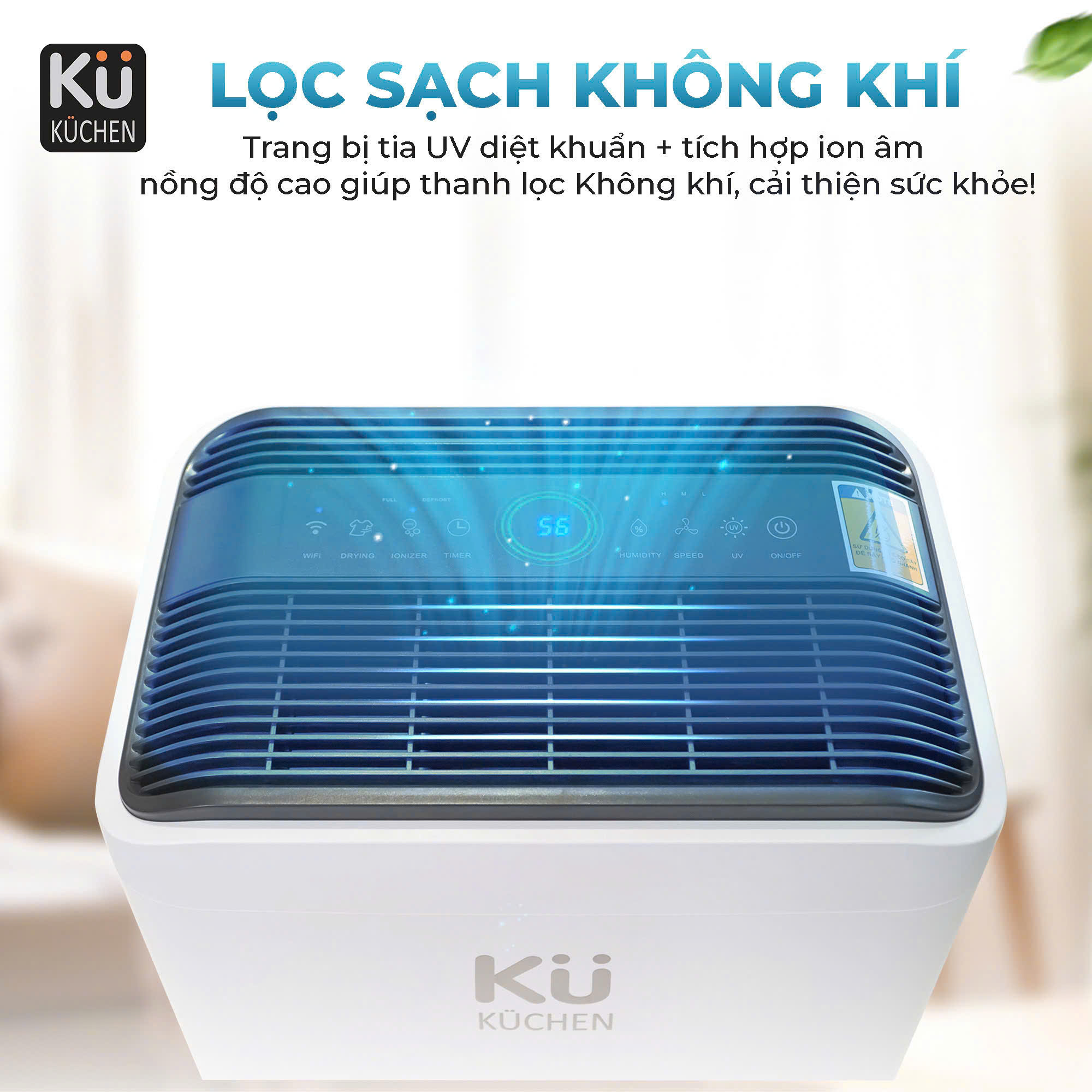 Tiện Lợi Mọi Lúc, Mọi Nơi: Thiết bị có khả năng kết nối với ứng dụng di động KUCHEN SMART, cho phép bạn dễ dàng điều khiển từ xa mọi lúc, mọi nơi. Bạn có thể theo dõi mức độ ẩm, bật/tắt thiết bị, hoặc điều chỉnh các cài đặt khác chỉ với vài cú chạm trên điện thoại. Tính năng này mang đến sự tiện lợi tối đa, giúp bạn quản lý và kiểm soát không khí trong nhà một cách hiệu quả ngay cả khi không có mặt tại nhà.