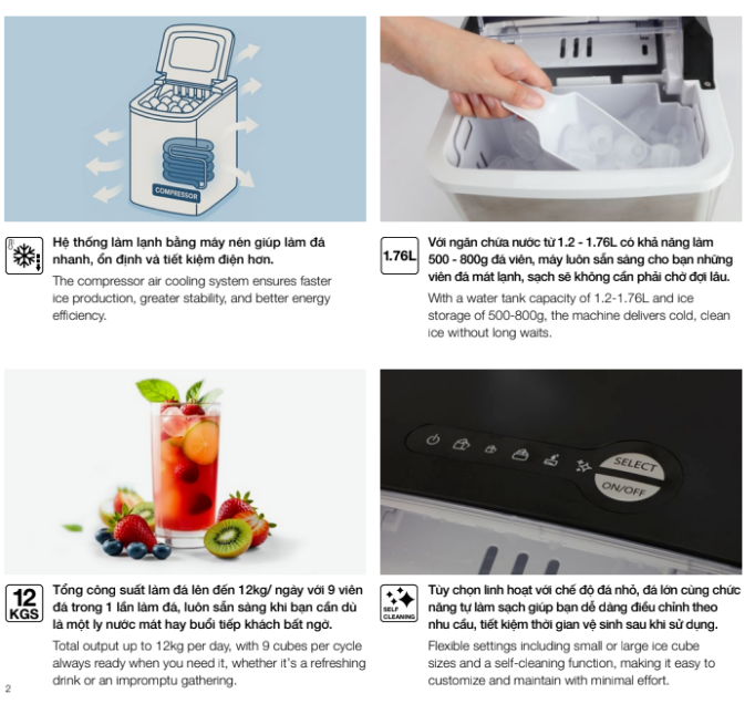 - 9 viên đá mỗi chu kỳ, Công suất làm đá: 12kg/24 giờ