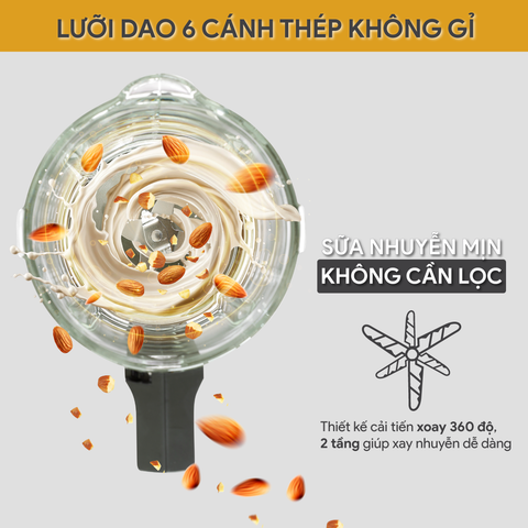 Lưỡi dao 6 cánh có răng cưa được làm từ thép không gỉ sắc bén đảm bảo an toàn cho sức khỏe, với thiết kế 3 cánh hướng lên và 3 cánh hướng xuống giúp xay nhuyễn thực phẩm hơn. Bên cạnh đó, lưỡi dao xoay 360 độ của lưỡi dao tạo ra sữa hạt mịn màng, không cần lọc lại sau khi xay xong.