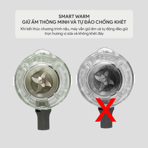 Ngoài ra, máy còn có chương trình Smart Warm – tự đảo chống khét và giữ ấm thông minh. Sau khi xay nấu xong, máy sẽ không tắt hẳn mà chuyển qua chế độ đảo và nhồi giúp sữa luôn được hâm nóng, không bị tách nước hoặc lắng đọng xuống đáy cối.