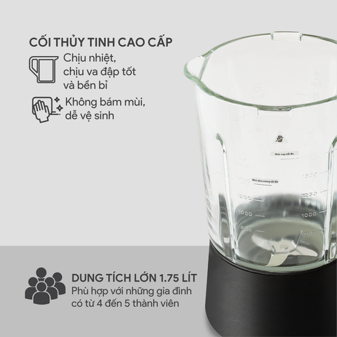 Cối xay có dung tích lên đến 1.75 lít, phù hợp cho các gia đình có từ 4 đến 5 thành viên. Ngoài ra, cối được làm từ chất liệu thủy tinh cao cấp, đảm bảo sự an toàn khi sử dụng, đồng thời chịu nhiệt tốt và bền bỉ theo thời gian. Đặc biệt, đáy cối được phủ lớp men Ceramic chống dính, giúp chống dính thực phẩm trong quá trình sử dụng và tiết kiệm thời gian khi vệ sinh sau mỗi lần sử dụng.