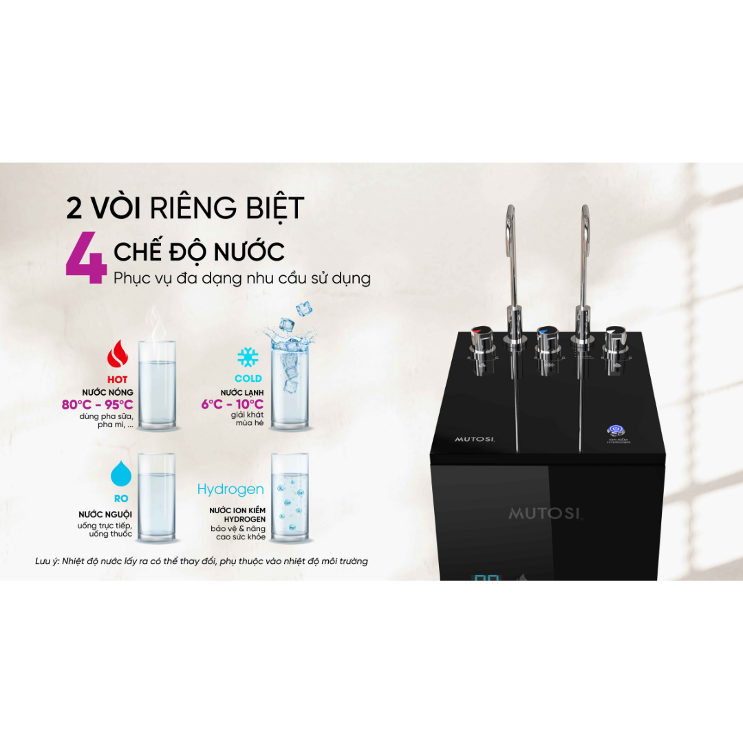 Máy lọc nước iON Kiềm Hydrogen MP-TS1029H của Mutosi có thiết kế tách biệt 2 đường nước tinh khiết và nước ion kiềm hydrogen, người dùng sử dụng tùy chọn theo nhu cầu: nước tinh khiết dùng nấu ăn, pha sữa, nước uống cho trẻ nhỏ; nước ion kiềm Hydrogen dùng cho người có nhu cầu hỗ trợ chăm sóc sức khỏe.