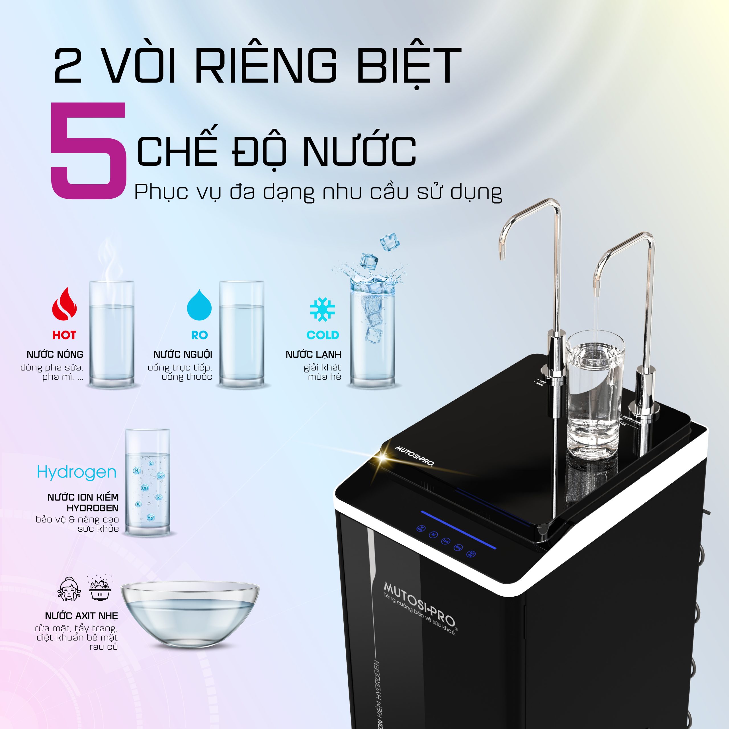 - 1 vòi lấy nước RO nguội, nước ion kiềm Hydrogen khoáng, hoặc nước axit nhẹ (pH 5.5 – 6.5)