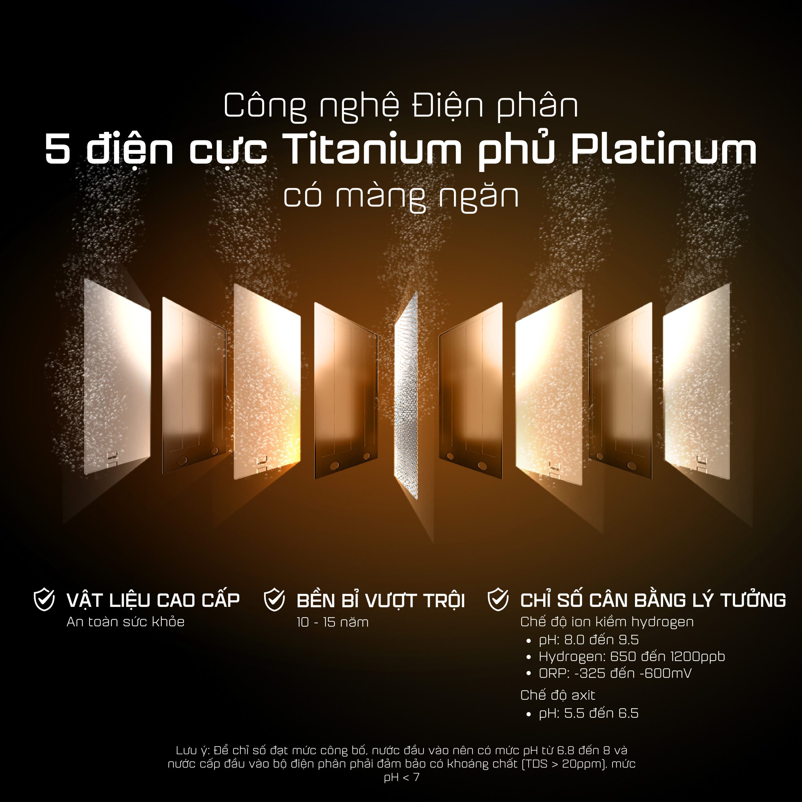 - Công nghệ điện phân 5 điện cực Titanium phủ Platinum có màng ngăn cao cấp