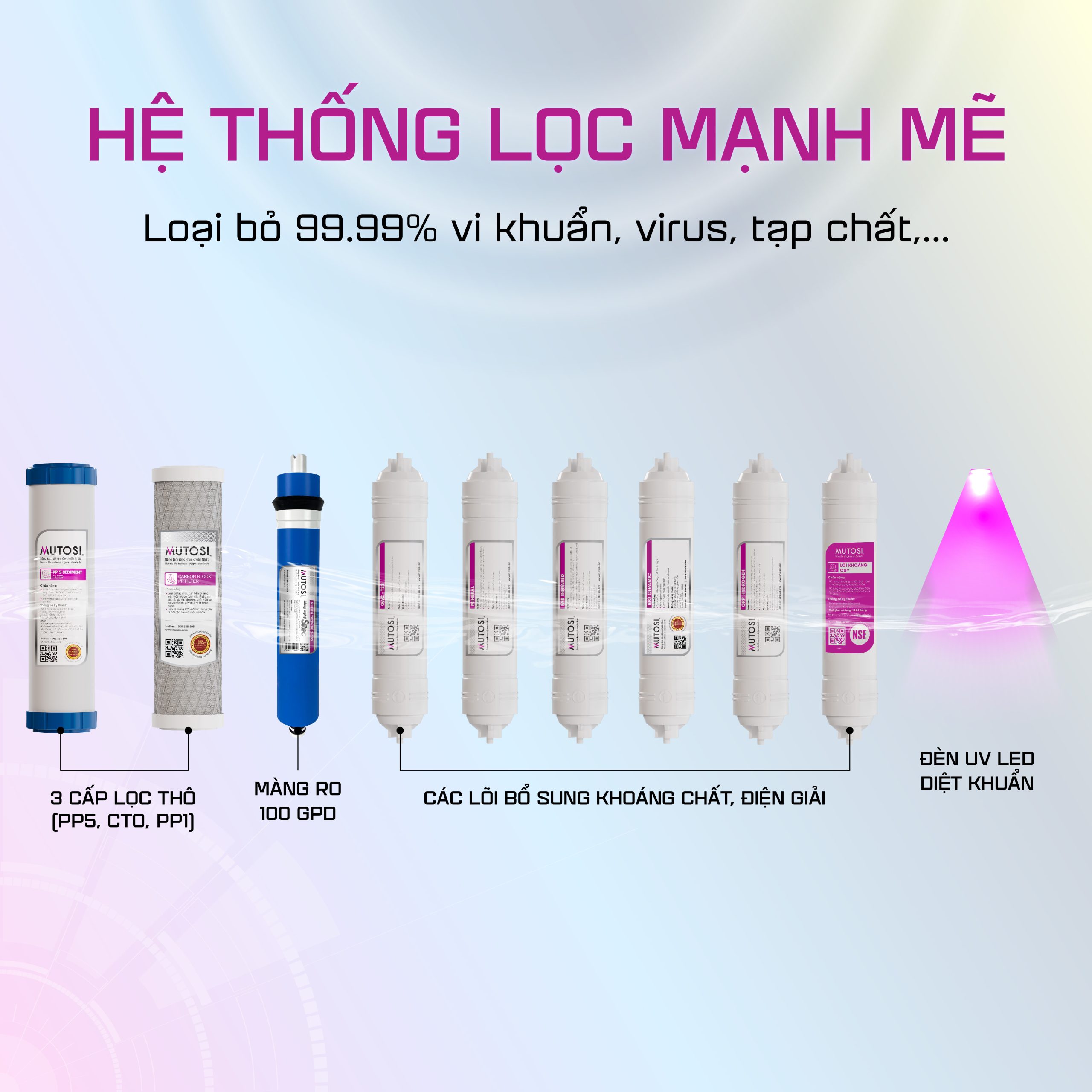 - Kèm theo cấp lọc đèn UV LED: diệt khuẩn và chống tái nhiễm khuẩn, cao cấp và an toàn hơn lõi nano bạc vì có khả năng diệt khuẩn bằng tia UV (sóng điện từ) và không tốn chi phí thay lõi