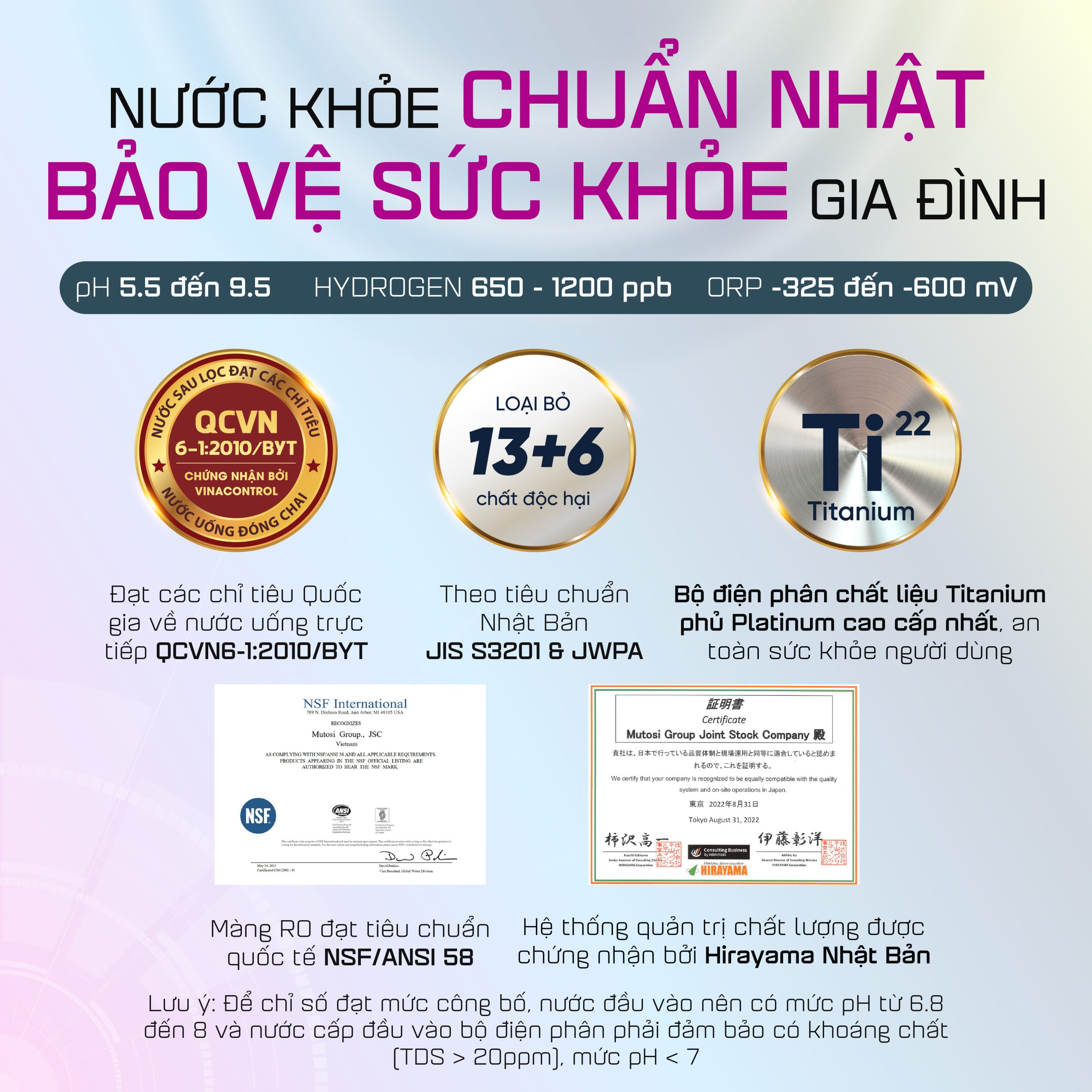 MÁY LỌC NƯỚC ĐIỆN GIẢI ION KIỀM HYDROGEN MUTOSI MP-99PRO ĐẠT TIÊU CHUẨN CHẤT LƯỢNG TRONG NƯỚC VÀ QUỐC TẾ