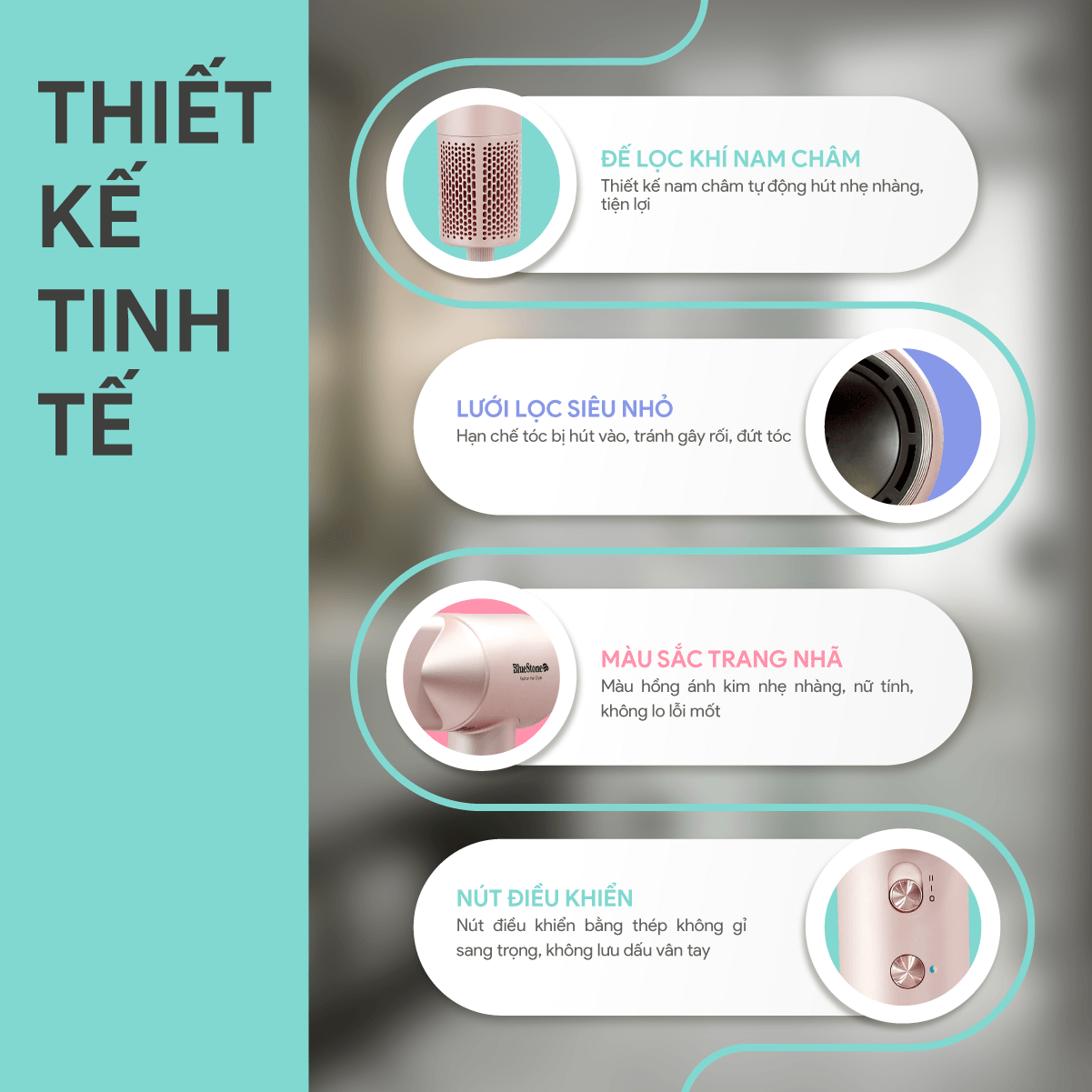 Máy sấy tóc BlueStone HDB-1975 được thiết kế tinh tế, nâng tầm trải nghiệm người dùng. Đế lọc không khí nam châm tự động hút nhẹ nhàng tiện lợi, bên cạnh đó lưới lọc siêu nhỏ hạn chế tóc bị hút vào, tránh gây rối hoặc đứt tóc. Đây là yếu tố quan trọng mà người dùng quan tâm khi sử dụng máy sấy tóc. Màu sắc của máy nhẹ nhàng, trang nhã, nút điều khiển bằng thép không gỉ, tránh lưu lại dấu vân tay.
