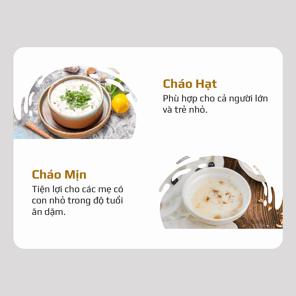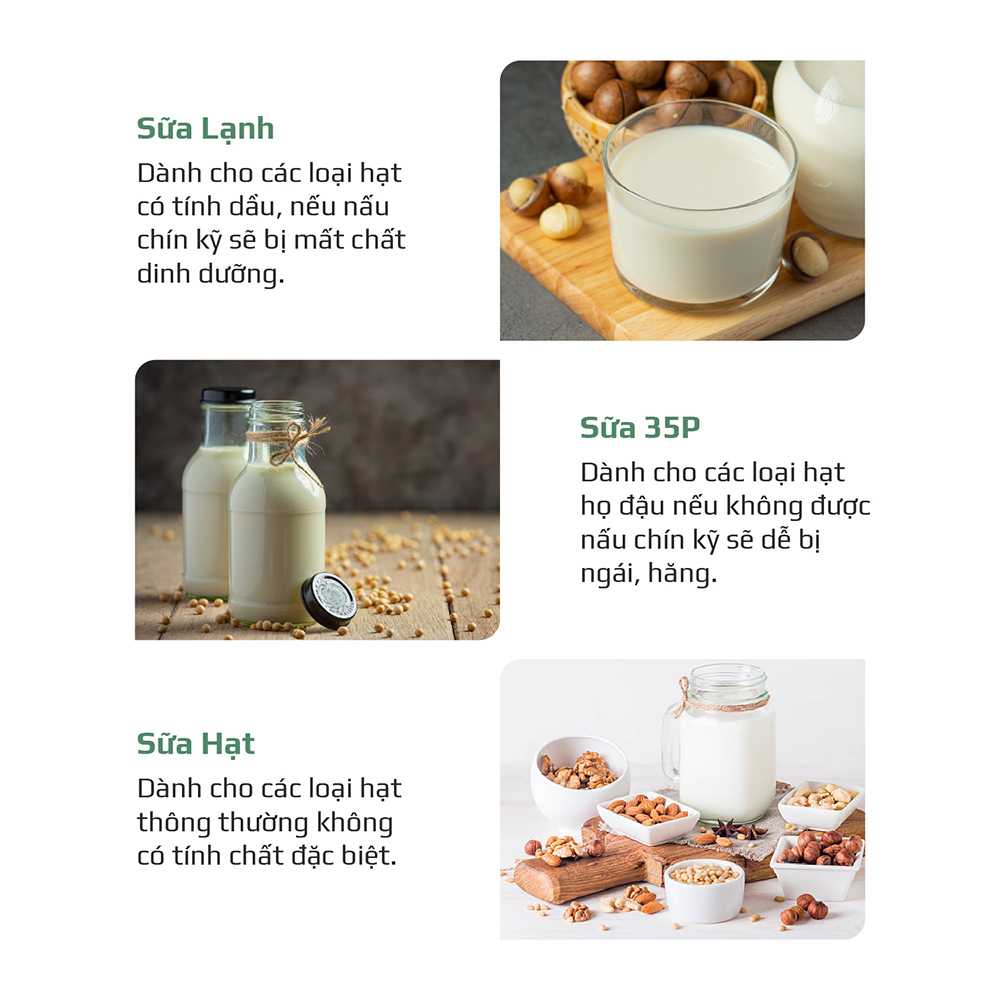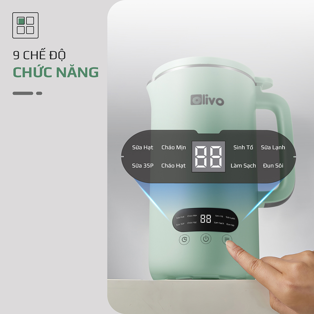 - 9 chế độ cài sẵn hiển thị tiếng Việt bao gồm: Sữa hạt, sữa lạnh, sữa hạt 35 phút, cháo mịn, cháo hạt, sinh tố, đun sôi, làm sạch, hẹn giờ.