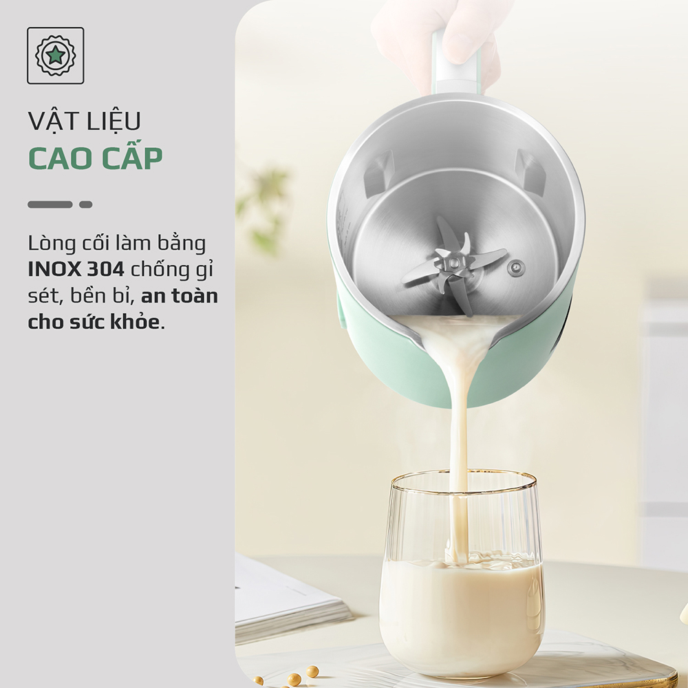 2. Công năng: Nấu sữa từ các loại hạt tự nhiên, nấu cháo, xay sinh tố, đun sôi, hẹn giờ, tự động làm sạch.
