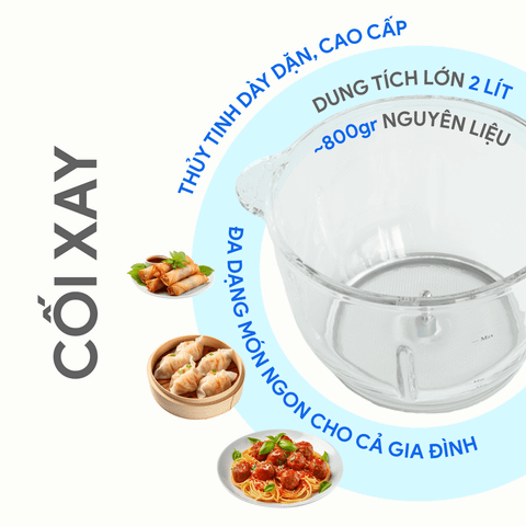 – Cối xay thịt thủy tinh 2L lớn, một lần có thể xay khối lượng lớn nguyên liệu.