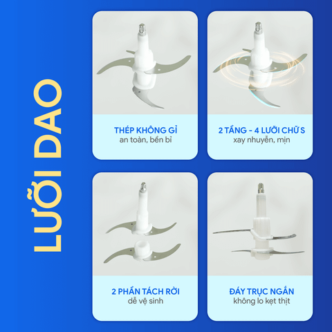 + Lưỡi dao xay thịt: 2 tầng – 4 lưỡi.