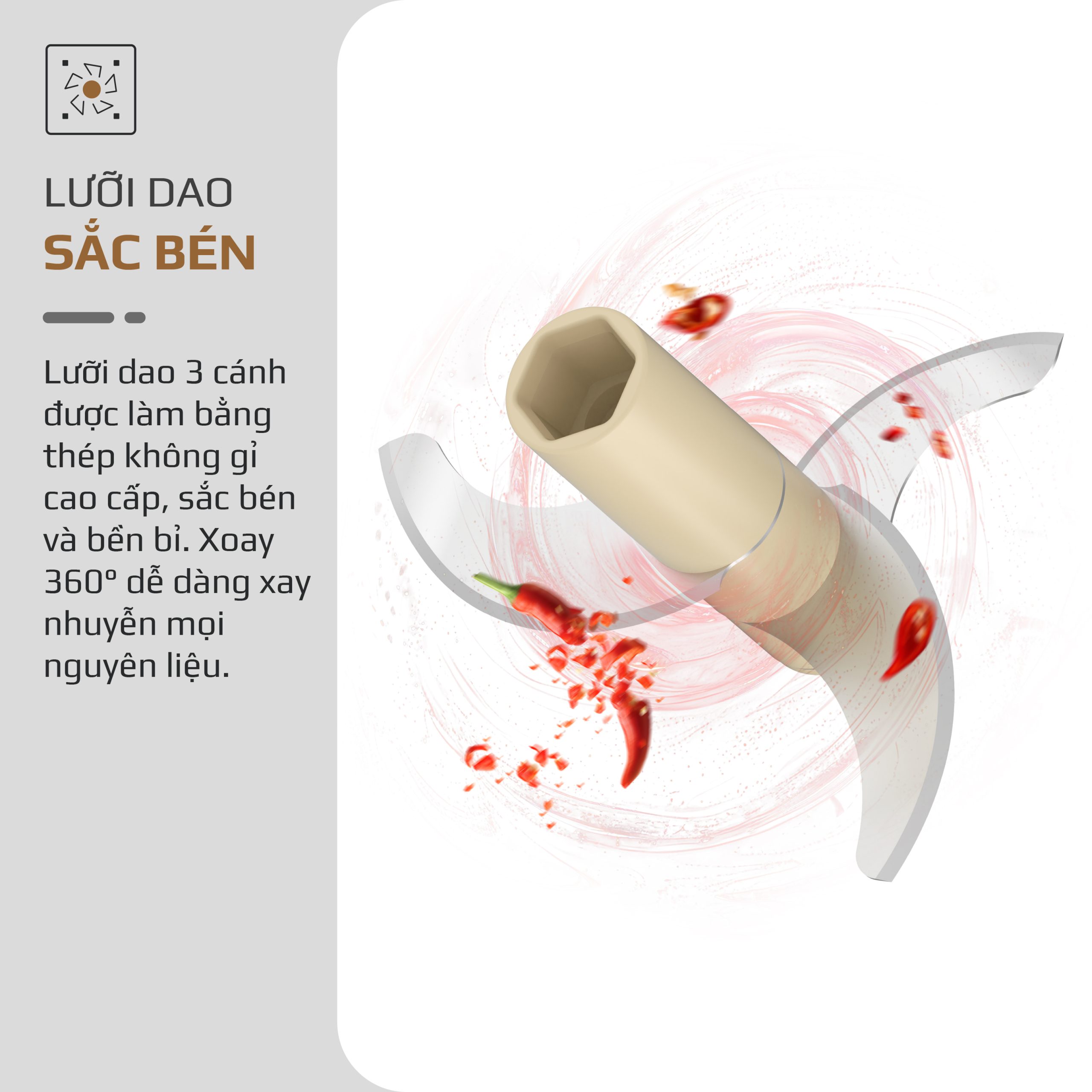 6. Công năng: Xay gia vị, xay thịt cá, rau củ, hạt…