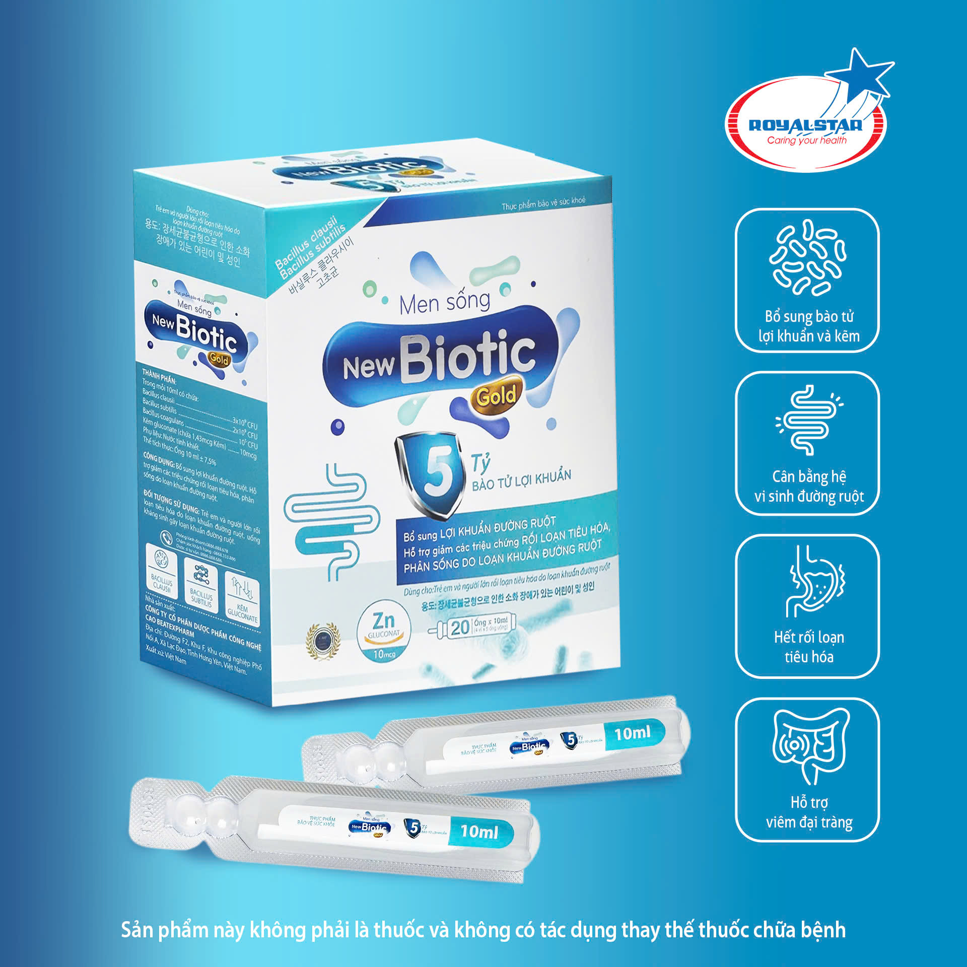 - Men sống New Biotic Gold được điều chế ở dạng hỗn dịch (Chứa 5 tỷ bào tử lợi khuẩn) đây là trạng thái dẫn truyền tốt nhất, lợi khuẩn phủ đều bề mặt ruột. Do đó, sẽ nhiều lợi khuẩn hơn đến được bề mặt của ruột, bám vào các “giá thể” là lớp lông nhung trên bề mặt ruột, tạo nên hiệu quả rõ ràng cho sản phẩm, giúp giảm nhanh cơn đau do tình trạng rối loạn tiêu hóa do loạn khuẩn đường ruột, và các bệnh nhân bị viêm đại tràng.