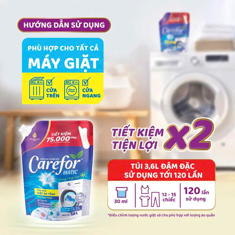 Nước giặt xả Carefor Matic – sử dụng công nghệ giặt đa tầng mang lại 3 tác động sâu chỉ trong 1 lần giặt: Sạch sâu – Kháng khuẩn – Tỏa hương giúp quần áo luôn sạch sẽ và thơm mát. Sản phẩm chuyên dụng dành cho máy giặt.