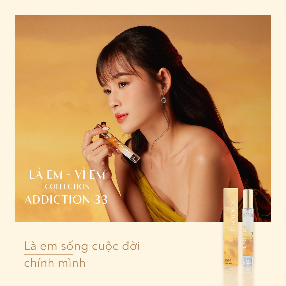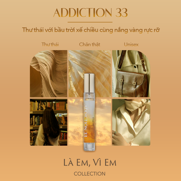 – Em thư thái tận hưởng “me time” dưới nắng vàng rực rỡ, cùng hương gỗ đa tầng trên nền hổ phách và xạ hương trứ danh. Hương thơm từ Addiction 33 thú vị như cách em bộc lộ sự bí ẩn của mình trong khoảnh khắc xế chiều