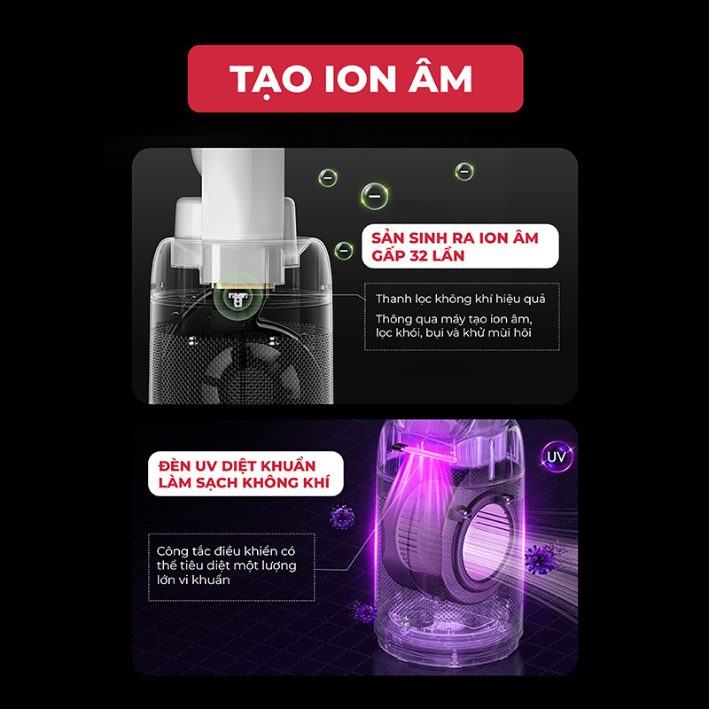 • Cải thiện chất lượng không khí: Ion âm giúp loại bỏ các hạt bụi, phấn hoa, alergen và khói, làm sạch không khí bạn hít thở.