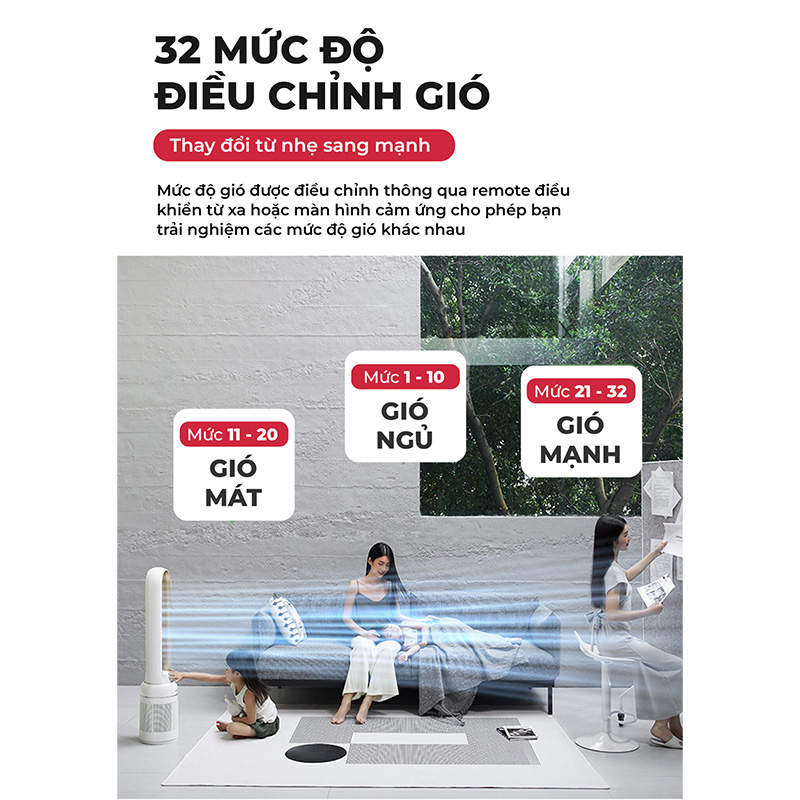 Quạt không cánh lọc không khí với 32 mức độ điều chỉnh gió mang lại khả năng tùy chỉnh luồng gió một cách tinh tế và phù hợp với nhu cầu cụ thể của người sử dụng. Dưới đây là một số lợi ích của việc có nhiều mức độ điều chỉnh gió: