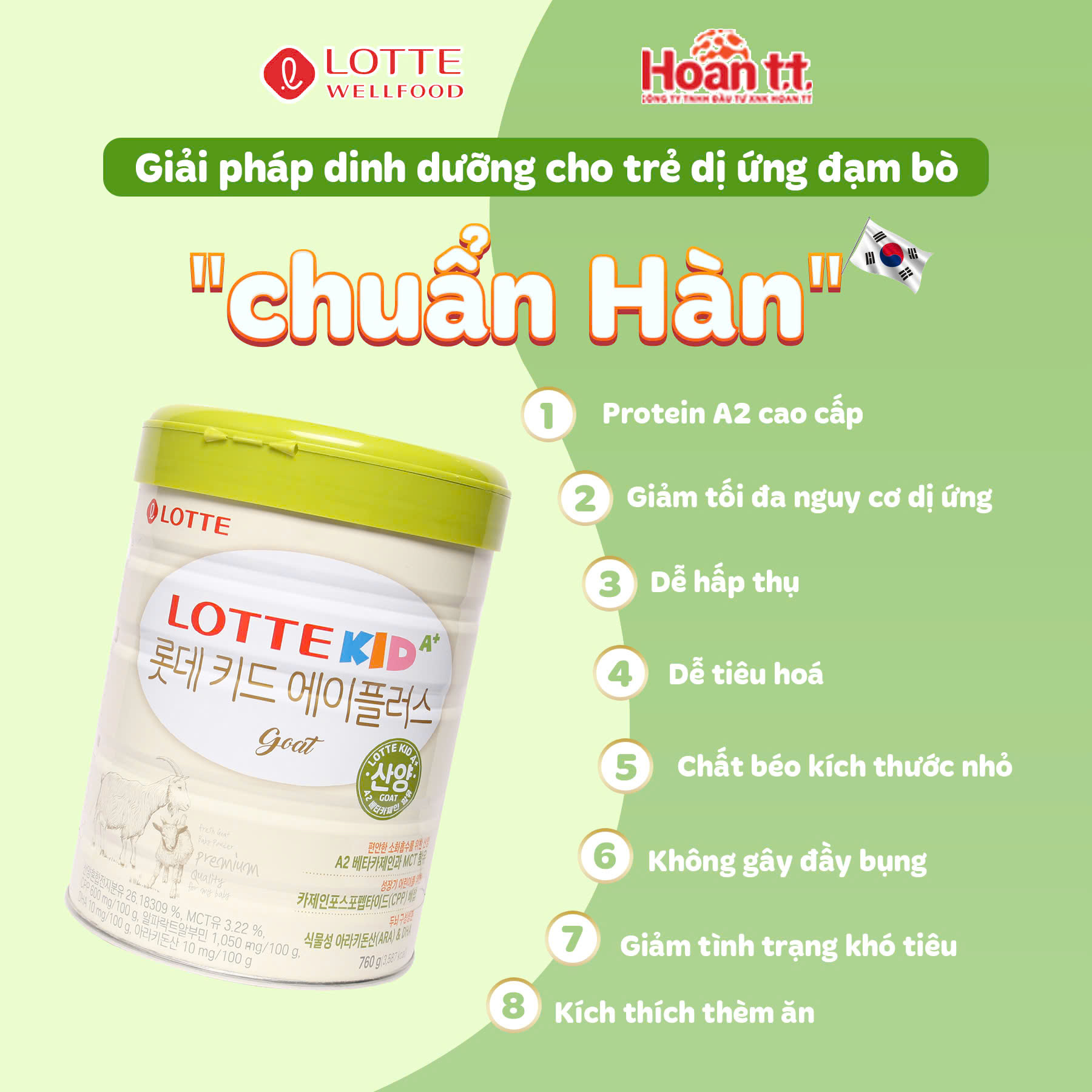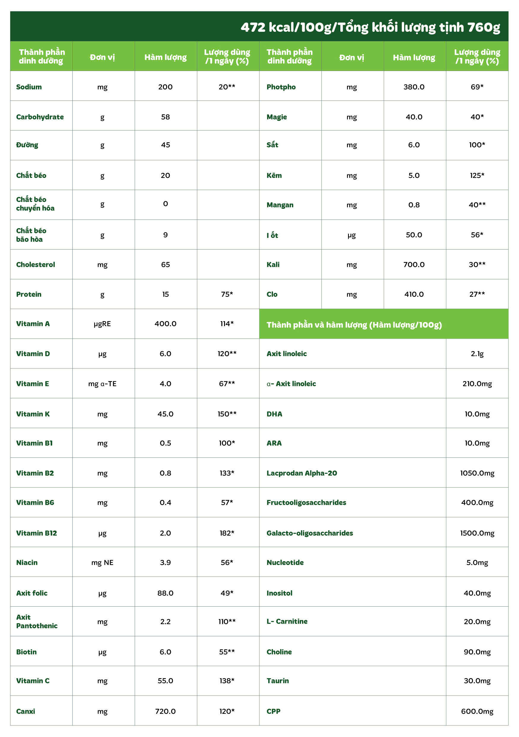 Đường sữa (nhập khẩu/Mỹ, Đan Mạch, Úc…), hỗn hợp bột sữa dê 26.18309% (sữa dê, bột Whey sữa dê khử muối Hà Lan), hỗn hợp dầu ăn (dầu hướng dương high-oleic (nhập khẩu Tây Ban Nha, Achentina, Ucraina v.v., nữa đậu nành (nhập khẩu, Hà Lan, Nga, Thái Lan v.v.), dầu dừa (nhập khẩu/Indonesia, Philipines, Malaysia v.v.), L- Ascorbyl palmitate, d-Tocopherol (dạng hỗn hợp), dextrin, chiết xuất protein sữa, Galacto-oligosacarit 3.72%, đường, dầu MCT 3.22%, chất tăng cường dưỡng chất, Casein Hydrolysis Protein, 2.38%, Lacprodan Alpha-20. lecithin đậu nành, Fructooligosaccharides 0.48%, Sodium Citrate, Axit citric, muối tinh, dầu mỡ khác (DHA, Axit Arachidonic) 0.06%, beta carotin, dầu bắp, dầu đậu nành, hỗn hợp Nucleotide (chất tăng cường dưỡng chất), bột khuẩn sữa 0.4% (B.lactis) 100 triệu CFU/I lon