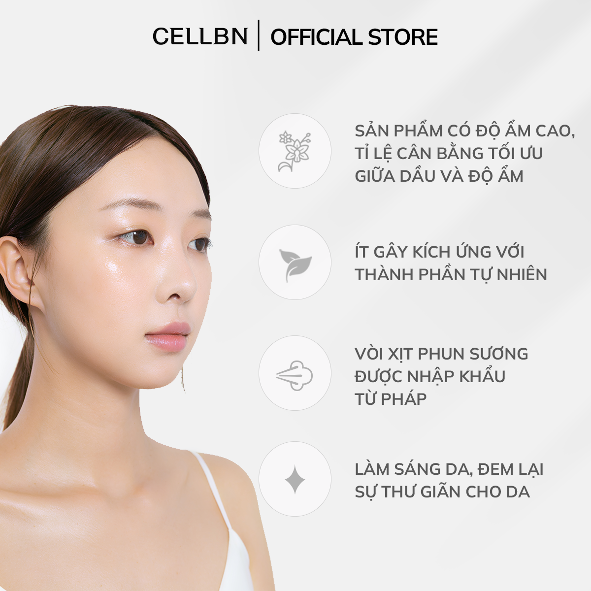Đặc biệt: vòi xịt phun sương siêu mịn (nhập khẩu Châu Âu): phân tán dưỡng chất đều khắp da, không bắn giọt nước, không gây bết dính kể cả khi đang trang điểm.