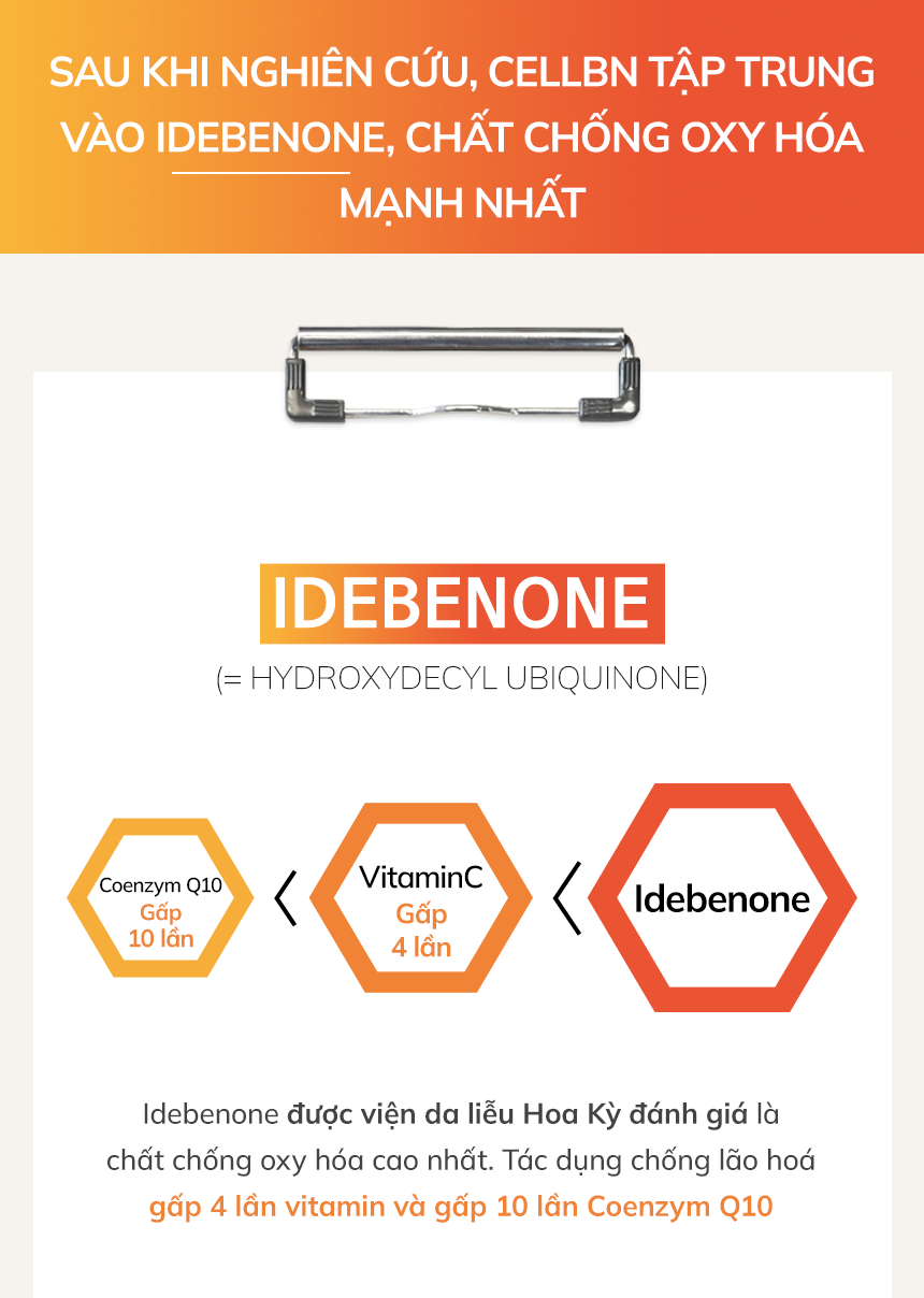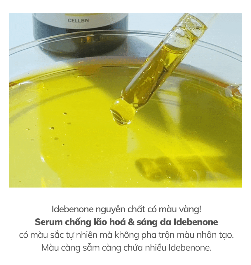 Bạn có biết thành phần Idebeone được ví như “vàng” trong làng sản phẩm chống lão hoá, là “thần dược” về việc đẩy lùi các dấu hiệu khô sạm nếp nhăn trên da, đồng thời giúp làm giảm hình thành gốc tự do. Hoạt chất này có khả năng chống oxy hoá cực kì mạnh mẽ, Serum CELLBN với hàm lượng Idebeone nồng độ cao đem lại hiệu quả rõ rệt trên làn da mặt & cổ của bạn. Điểm lưu ý khi dùng là chất serum này hơi dính, nên dùng buổi tối, sáng hôm sau khi rửa mặt bạn sẽ cảm nhận được làn da được cấp ẩm chuyên sâu và căng mọng hơn hẳn. Việc chống lão hoá hãy thực hiện ngay khi còn trẻ, đừng để nếp nhăn đã sâu mới bắt đầu sử dụng nhé. Sản phẩm này thích hợp với làn da khô, da bắt đầu có dấu hiệu lão hoá.
