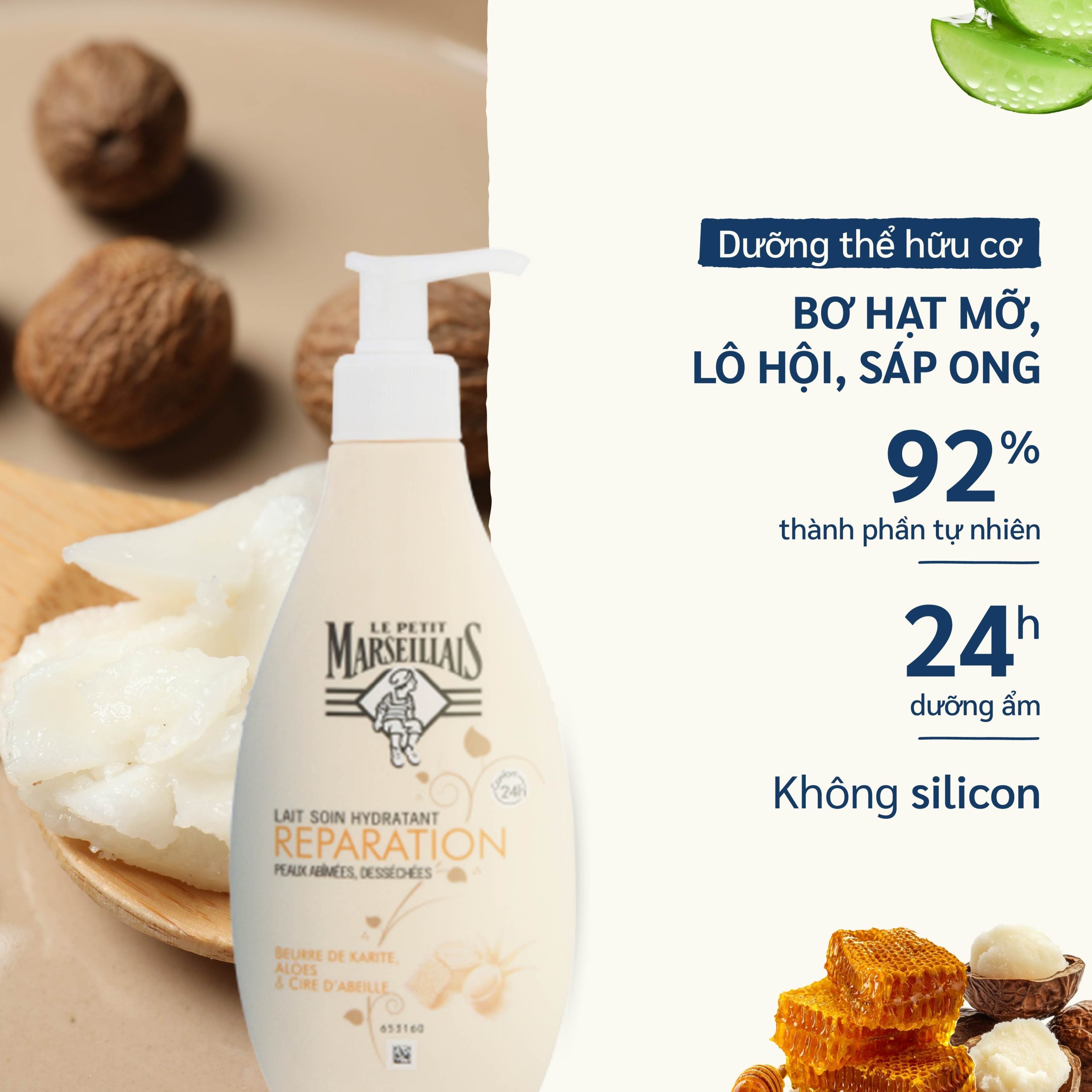 SỮA DƯỠNG THỂ LE PETIT MARSEILLAIS HỮU CƠ 250ML bơ hạt mỡ, lô hội & sáp ong: