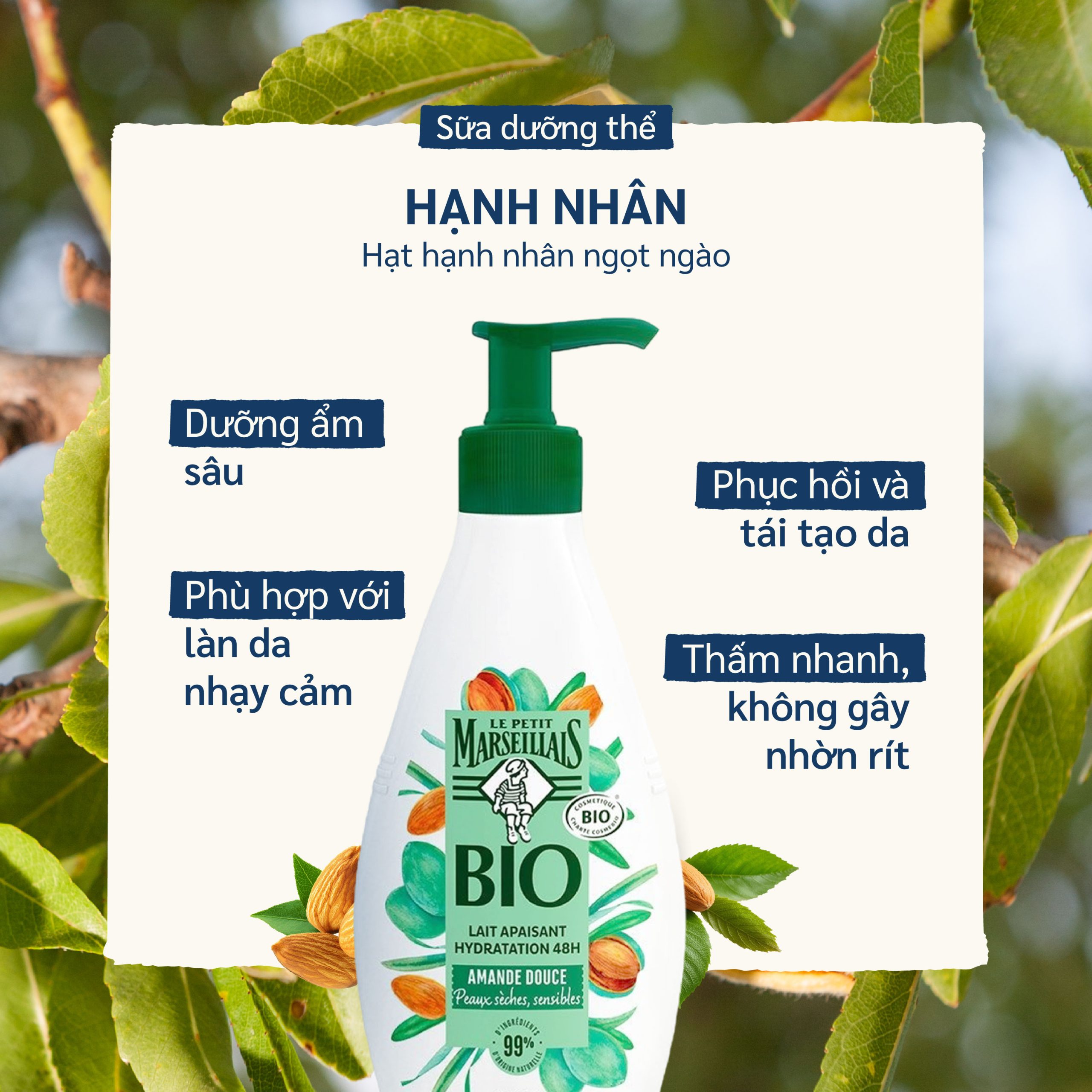 SỮA DƯỠNG THỂ LE PETIT MARSEILLAIS HỮU CƠ 250ML chiết xuất hạnh nhân: