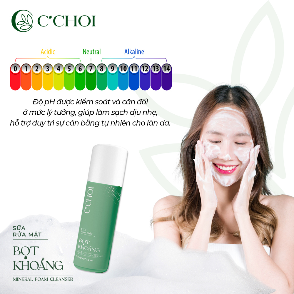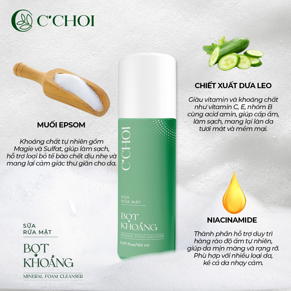 Sữa Rửa Mặt Bọt Khoáng – Mineral Foam Cleanser của C’Choi mang đến trải nghiệm làm sạch da nhẹ nhàng, với lớp bọt mịn giúp cuốn trôi bụi bẩn và mang lại cảm giác dễ chịu, thư giãn sau một ngày dài.